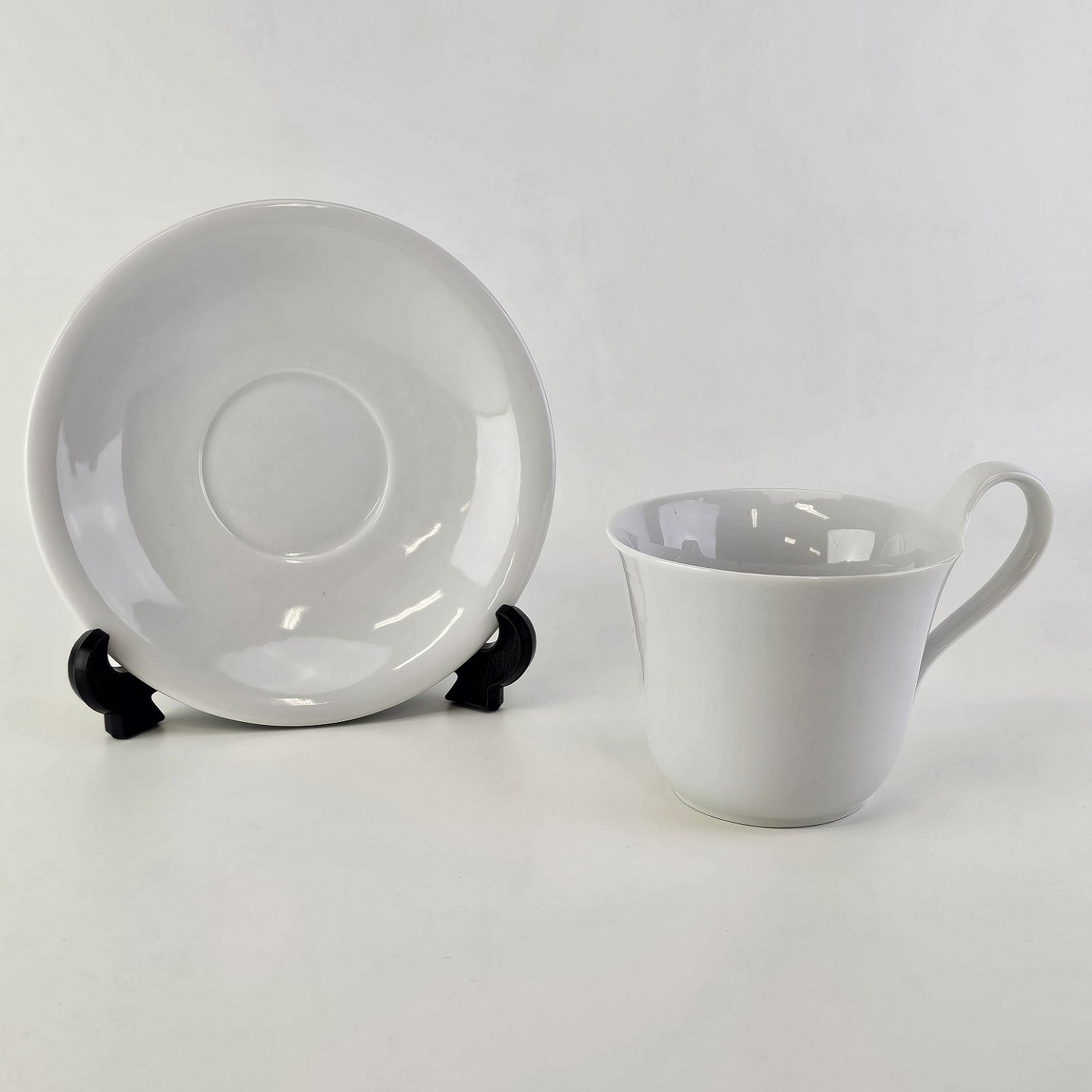 Kop med høj hank og underkop i glat hvidt porcelæn