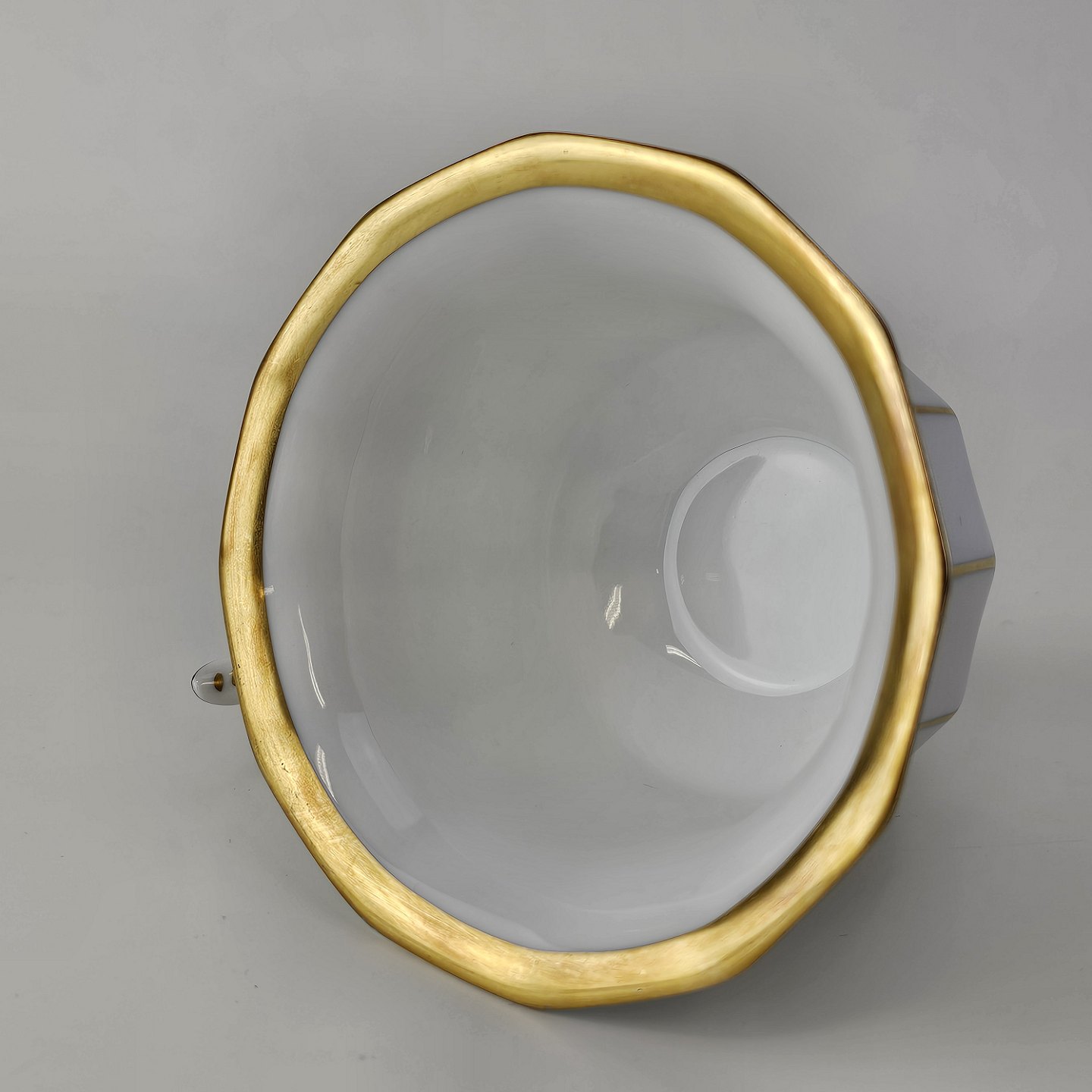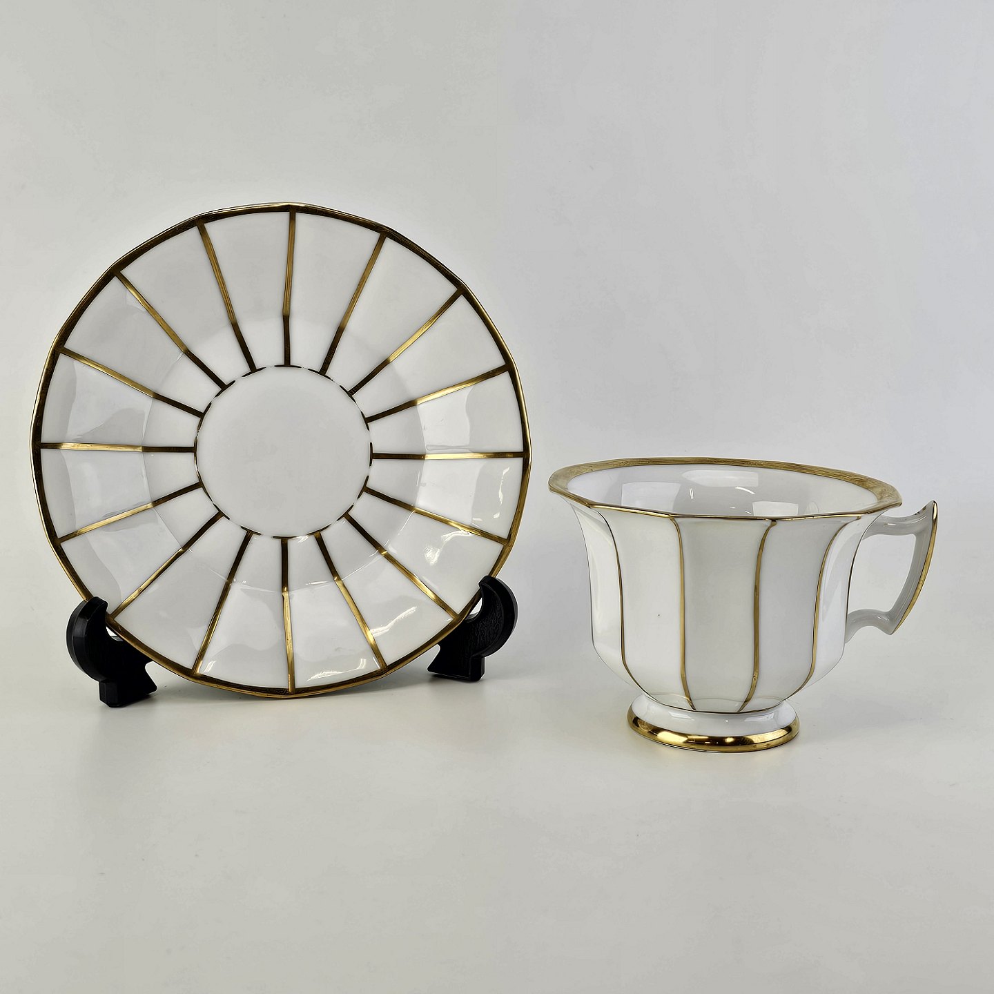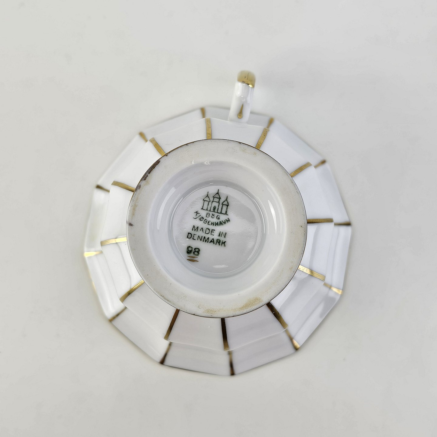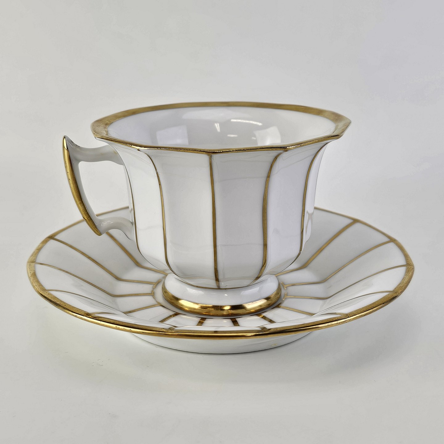 Kop og underkop med kantet form i hvidt porcelæn med gulddekoration og guldkant