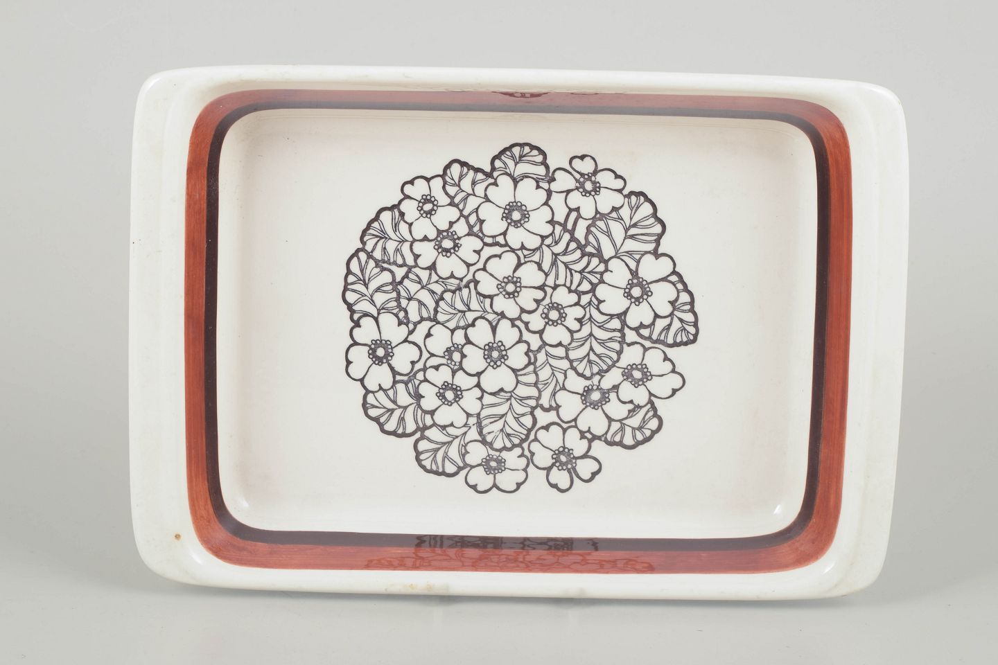 Rektangulært stentøjsfad med karakteristisk blomsterdekoration i brunlige og sorte toner, typisk for Gefles dekorative 70’er-udtryk.