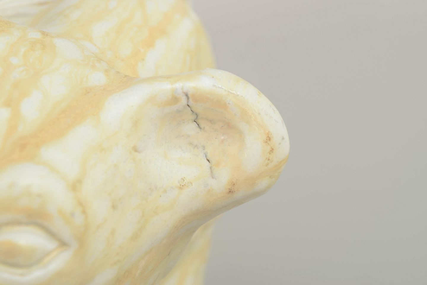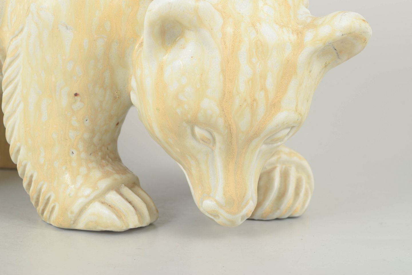 Meget stor figur i glaseret stentøj, formet som en nedadvendt, søgende isbjørn i Nylunds karakteristiske bløde, organiske stil. Den lyse glasur fremhæver den modellerede pelsstruktur og dyrets rolige tyngde.