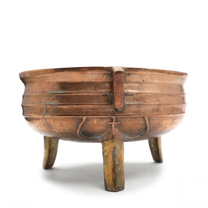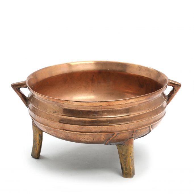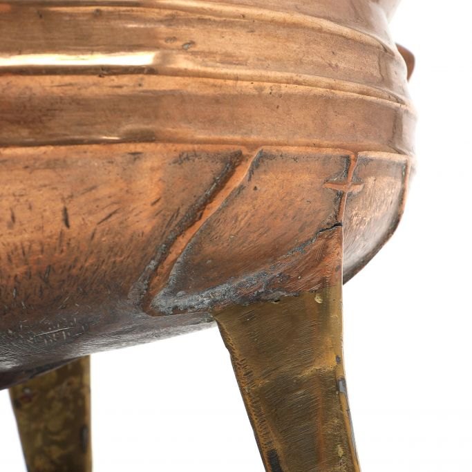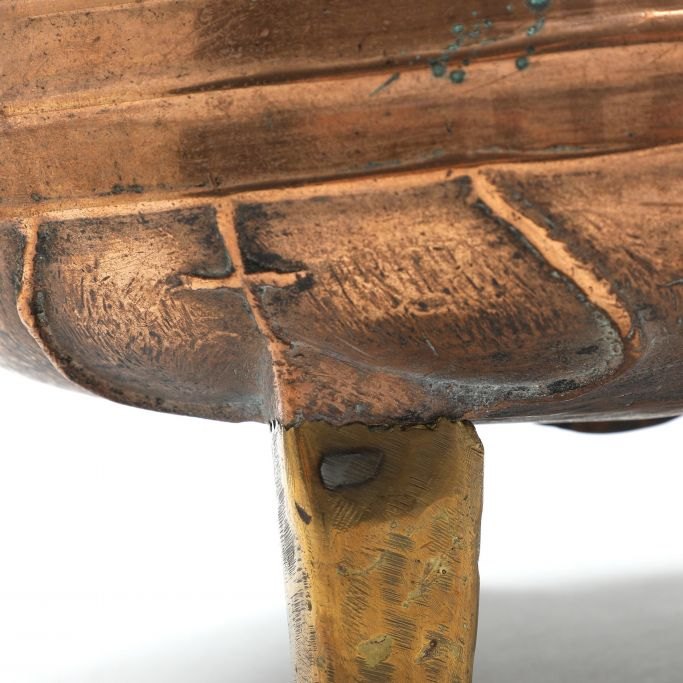 Renaissance trebens gryde af malm, 15./16. årh. Med dekorationer på siderne med bl.a. ribber. Repareret. Har fået tre ben tilføjet senere i messing. Gryden er nyere oppoleret. H.: 18,5 cm. Dia.: 31,5 cm.