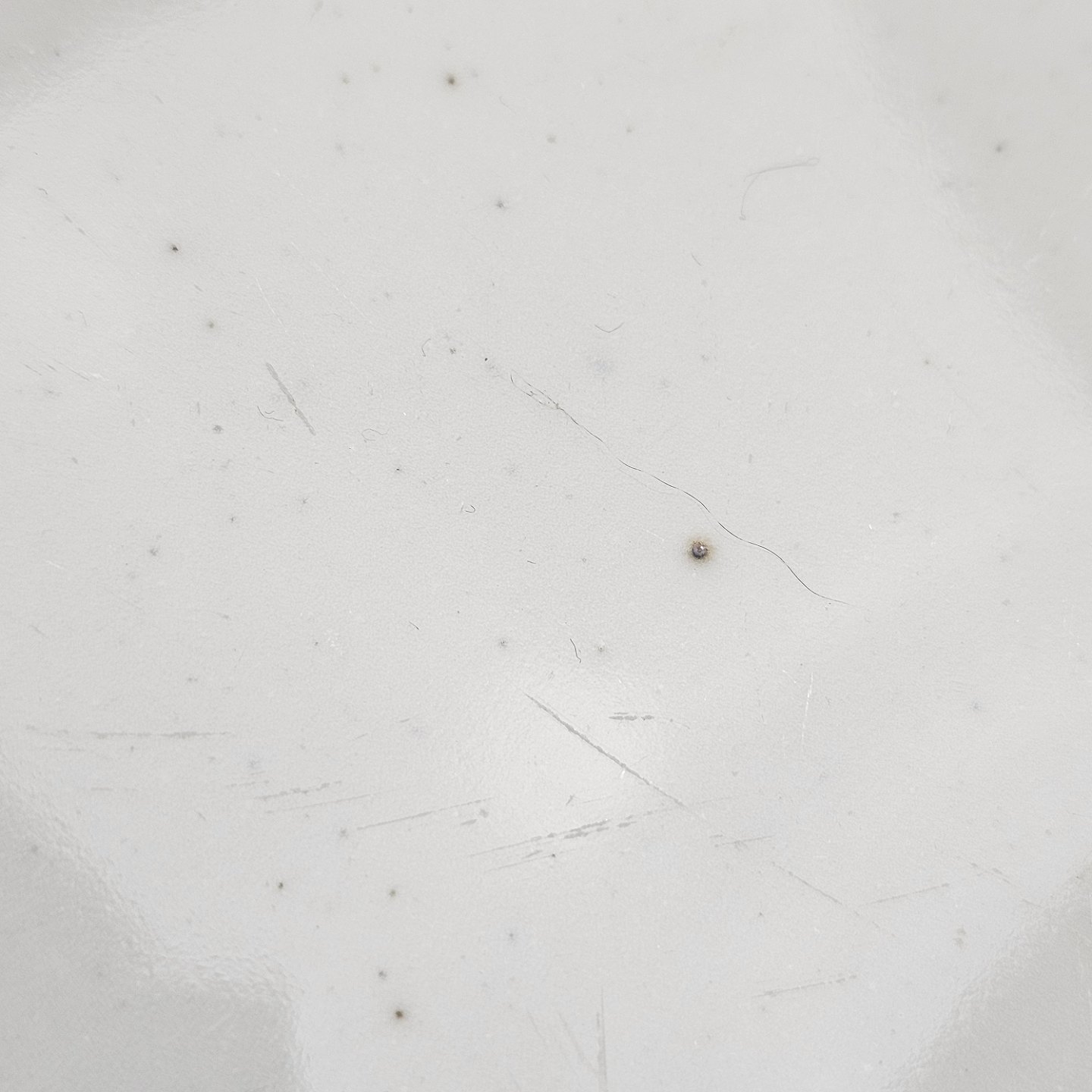 Rundt fad i stentøj med blå kant, jernpletter og hvid glasur
