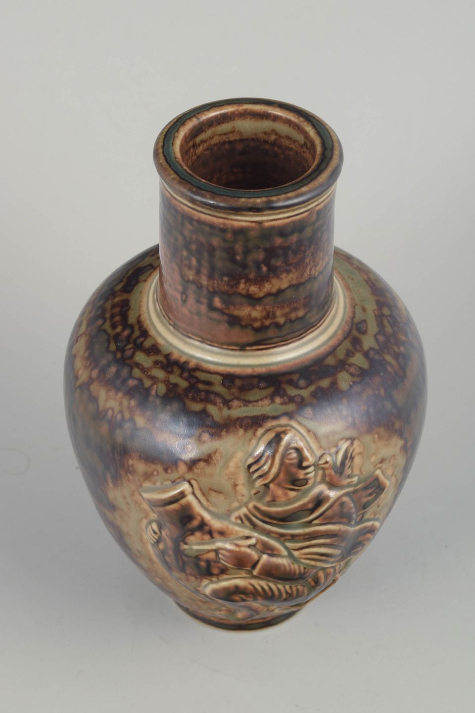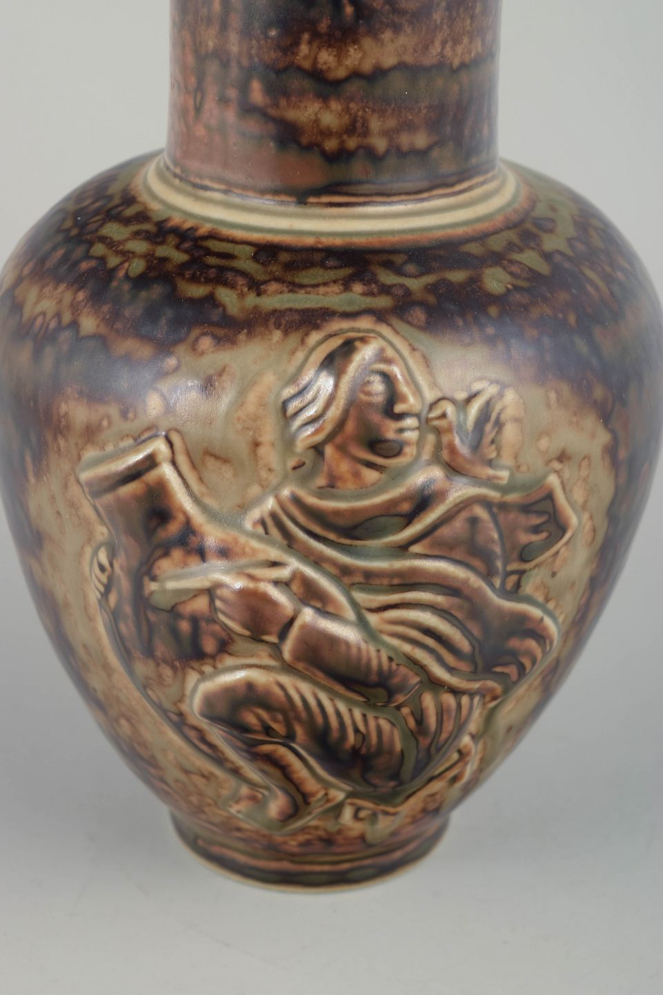 Skulpturelt dekoreret vase i den karakteristiske Sung-glasur, med reliefmotiv af figurativ scene. Den varme, løbende glasur fremhæver de plastiske detaljer og giver værket et markant, næsten metallisk skær.