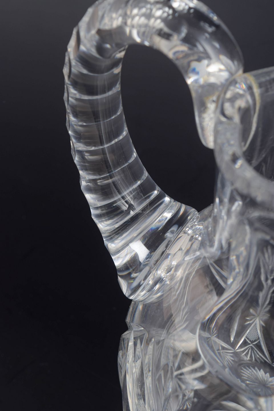 Elegant og solid kande i klart krystalglas med dybe slibninger i form af stjerne- og bladmotiver. Det tunge materiale og den markante dekoration giver kanden et klassisk, tidstypisk udtryk fra mellemkrigstiden.