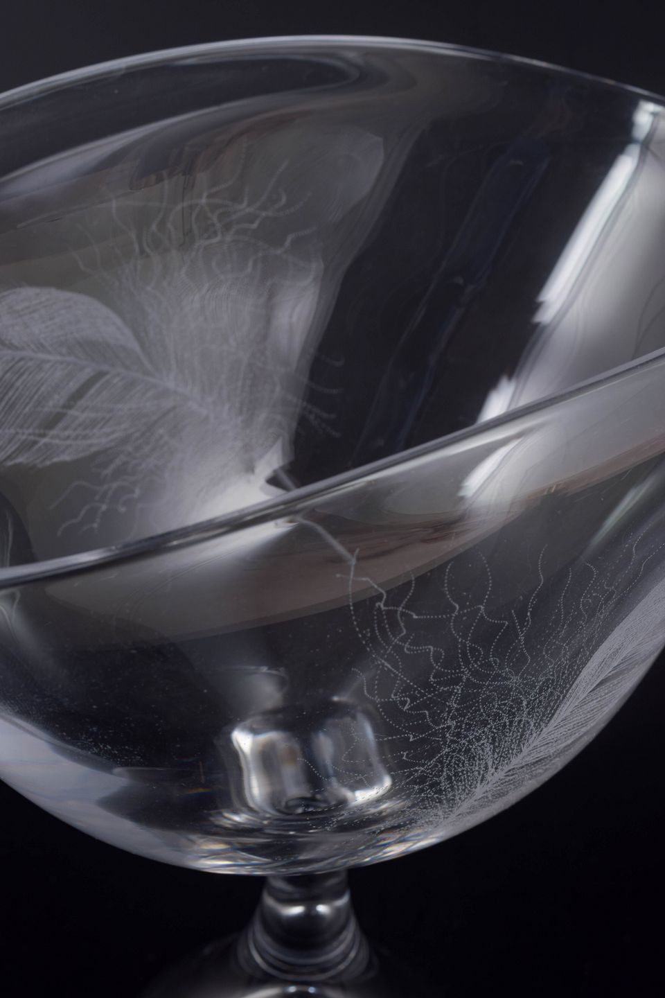 Elegant skål på fod med indlagte fjerlignende dekorationsstrøg i glasset. Motivet er et klassisk dekorativt element anvendt af Kosta. Den asymmetriske form og den høje, dobbeltformede fod giver skålen et moderne og skulpturelt udtryk.