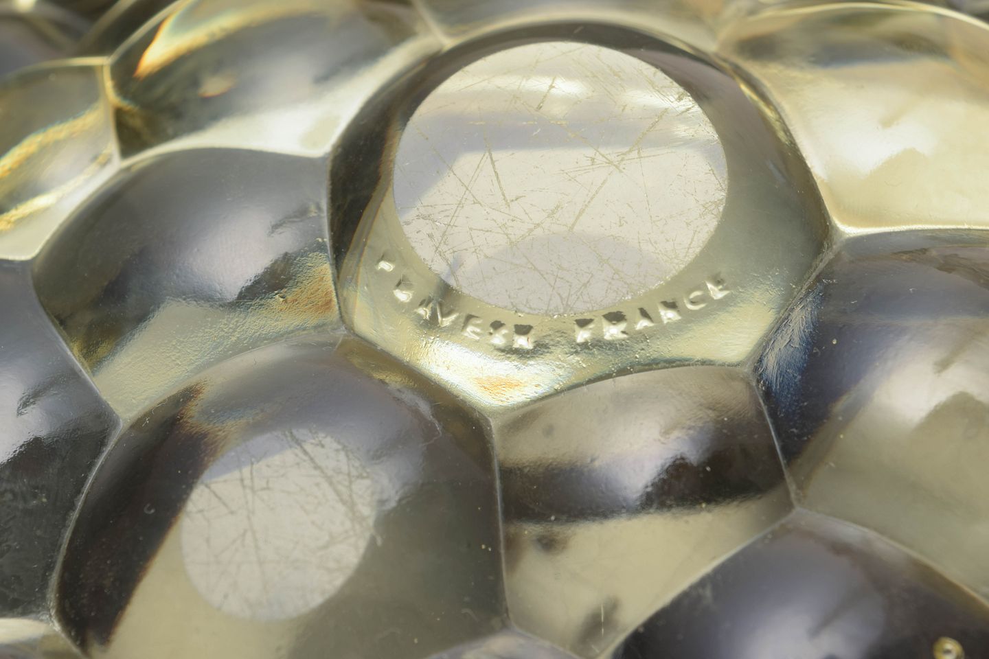 Sjælden gul skål i presset glas med typisk Art Deco-ornamentik og organiske, bølgede former omkring kanten. Pierre d’Avesn arbejdede med markante relieffer og klare geometriske strukturer, hvilket ses tydeligt i dette dekorative og eftertragtede eksempel.