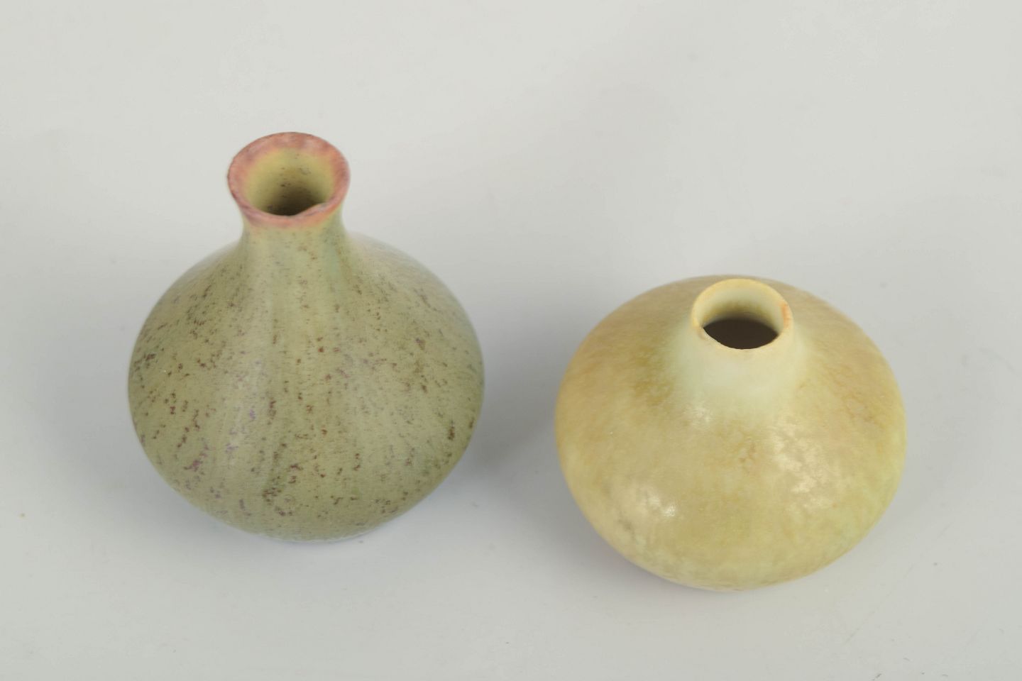 To elegante miniaturevaser i stentøj, begge med karakteristiske, bløde organiske former og subtile matte glasurer. Den ene i grønligt skær med rosa tone ved halsen, den anden i lysegule nuancer med fint spil i overfladen – typisk for Stålhane’s eksperimenterende glasurarbejde.