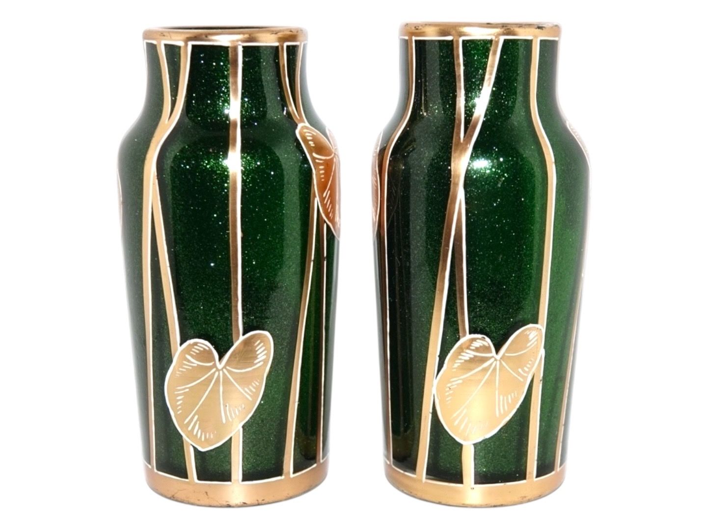 To små Jugend (Art Nouveau) grønne glas vaser med gulddekoration fra omkring 1900 til 1920.
