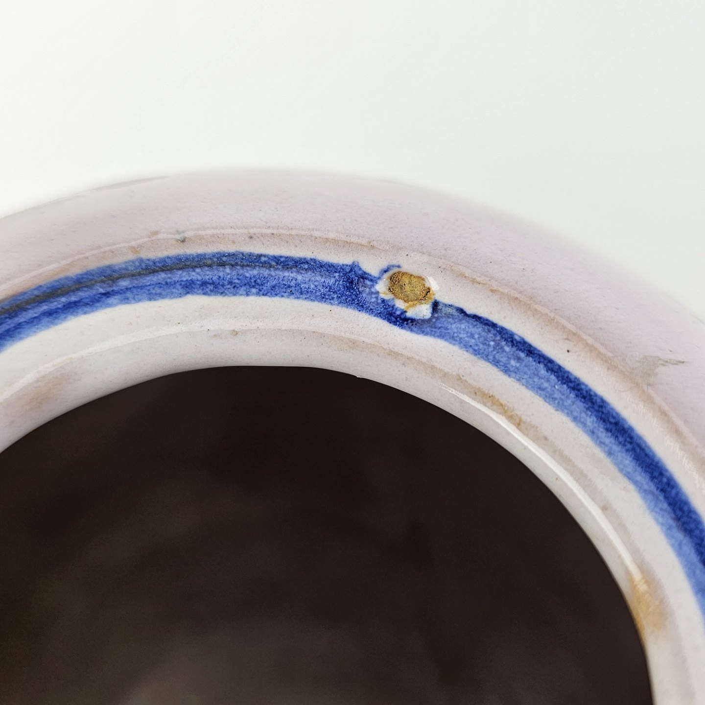 Fremstår med diverse små nister i overfladen og et hak i kanten ved åbningen