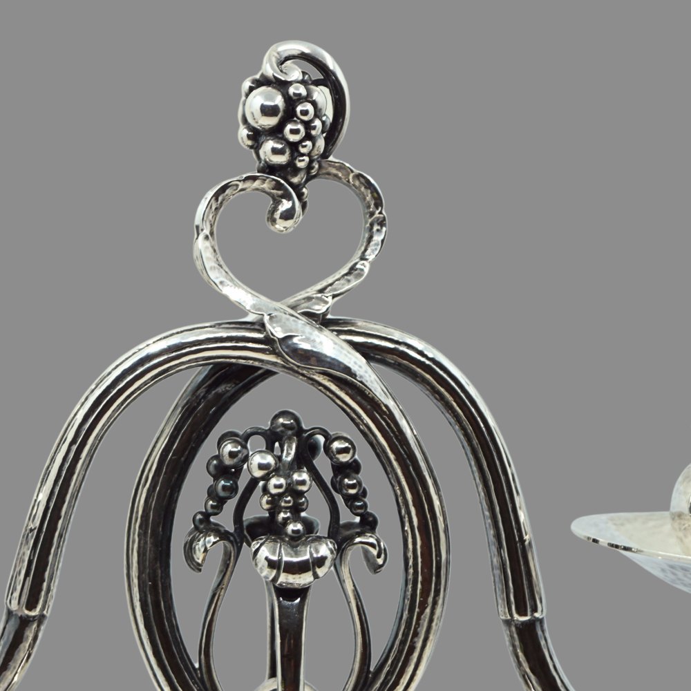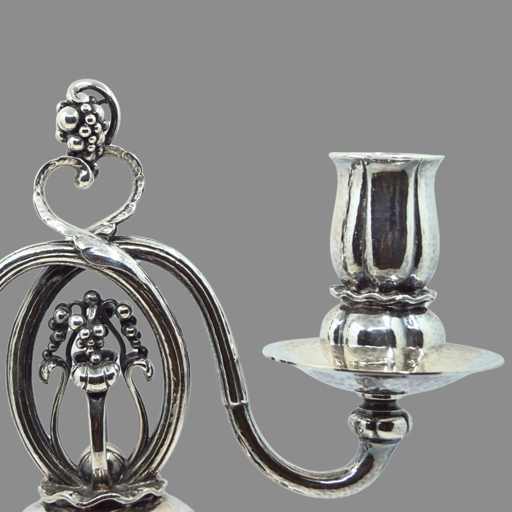 Georg Jensen; Massiv to armet kandelaber i hamret sterling sølv, prydet med druer og granatæble. Designet af Georg Jensen omkring 1914-1918. Dessin nr. 324.