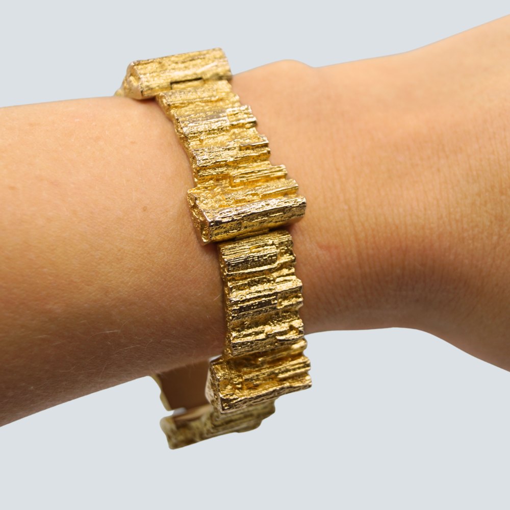 Björn Weckström for Lapponia; Leddelt armbånd af seks led i 14 kt. guld. Designet af Björn Weckström omkring 1970. L. 18 cm. b. 1,3-1,8 cm. 62 gram. Monteret med kasselås og sikkerhedslås. Stemplet "585 Finland Bjorn Lapponia"
