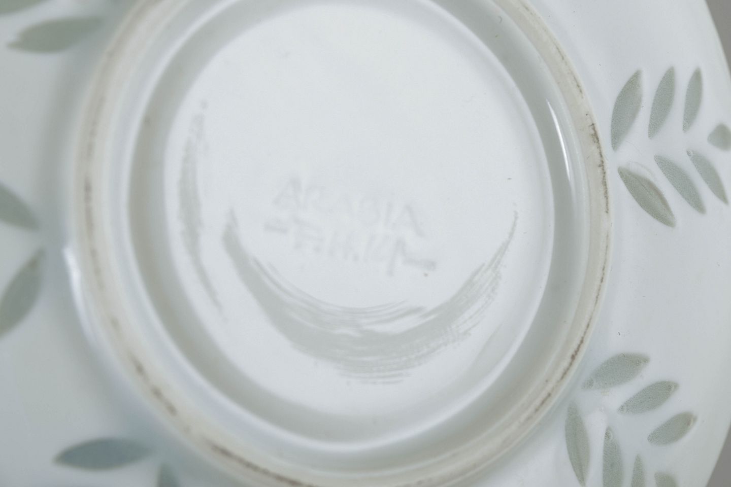 Elegant sæt bestående af tre mokkakopper med tilhørende underkopper i hvidt porcelæn, dekoreret med diskret bladornamentik udført i transparente, let grønligt tonede glasurfelter. Det lette og raffinerede udtryk samt de bløde, harmoniske former er karakteristisk for Friedl Holzer-Kjellbergs sene porcelænsdesign for Arabia.