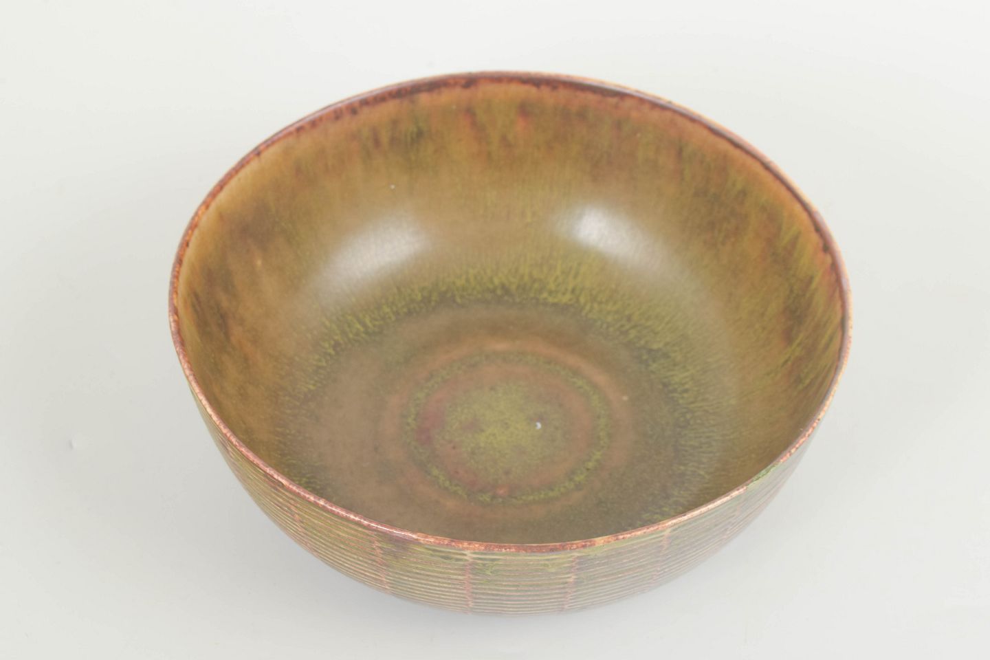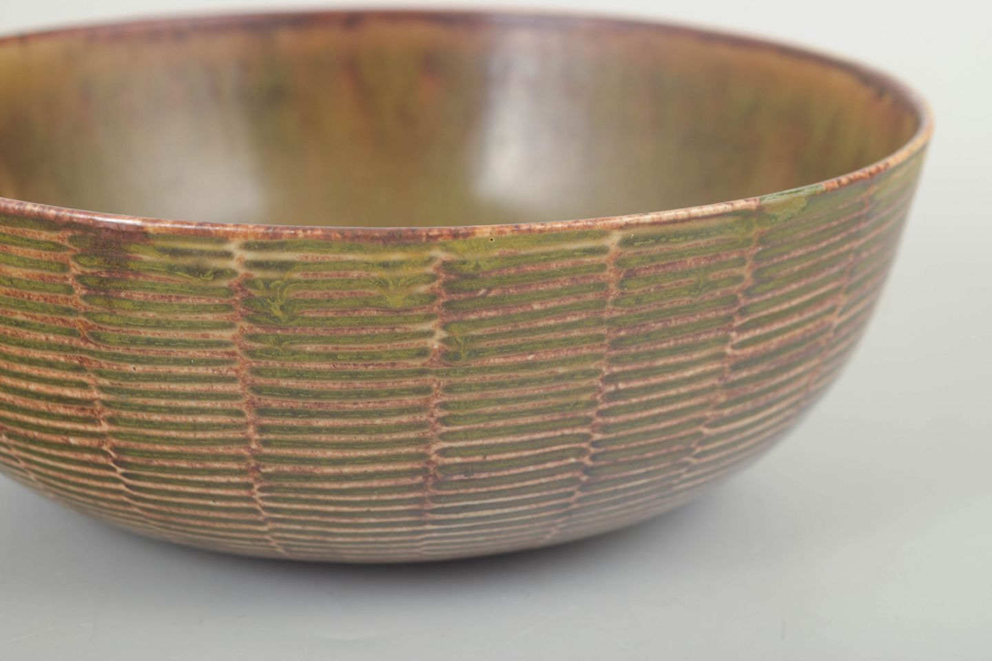 Lav, bred stentøjsskål med riflet overflade i et regelmæssigt horisontalt relief, karakteristisk for Axel Saltos geometrisk-organiske formsprog. Den riflede stil er én af Saltos tre karakteristiske stilarter. Glaseret i afdæmpede jordfarver med fine nuancer af grøn, brun og gyldne toner, som fremhæver reliefstrukturen og giver skålen et levende, stofligt udtryk.