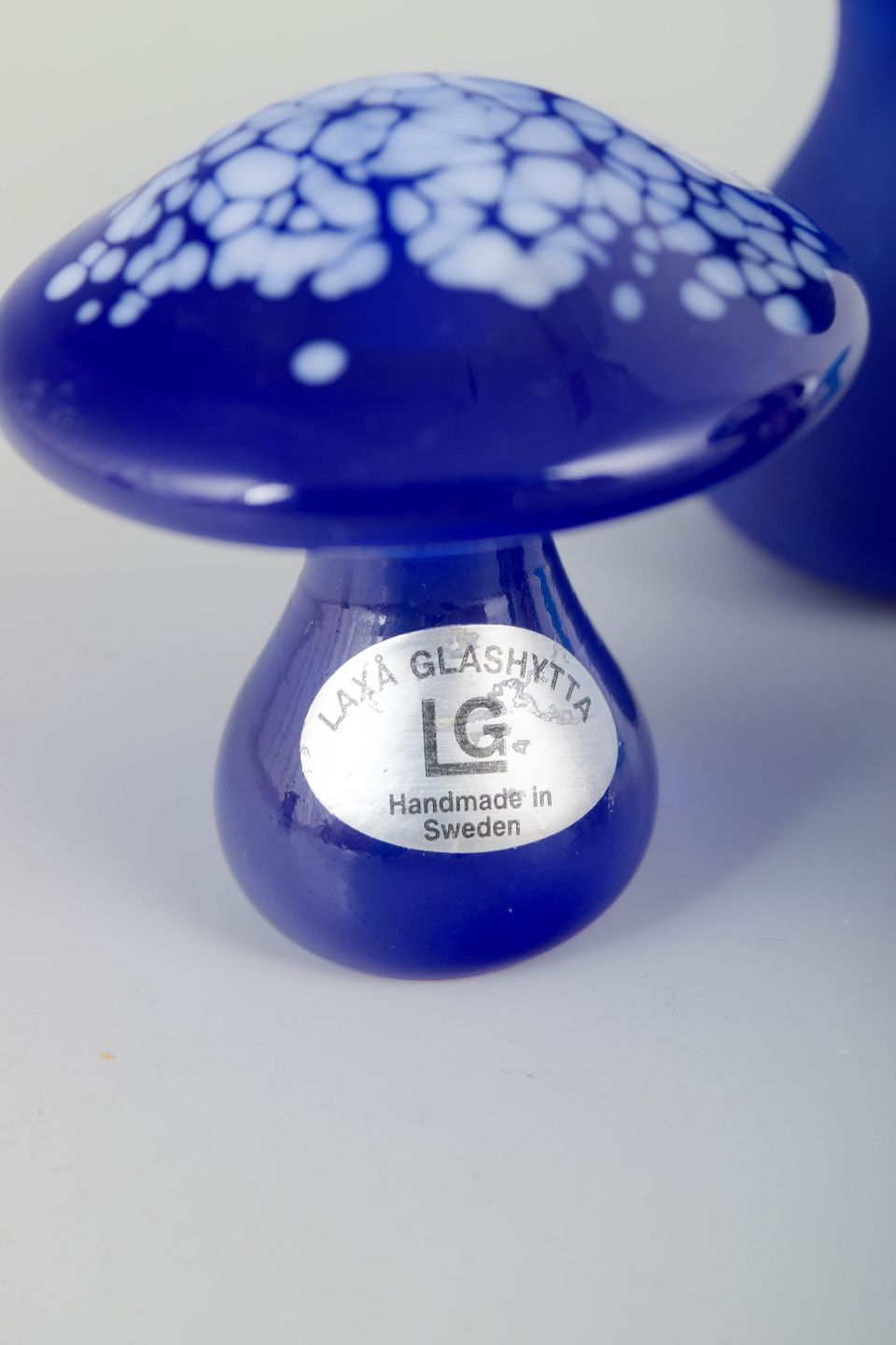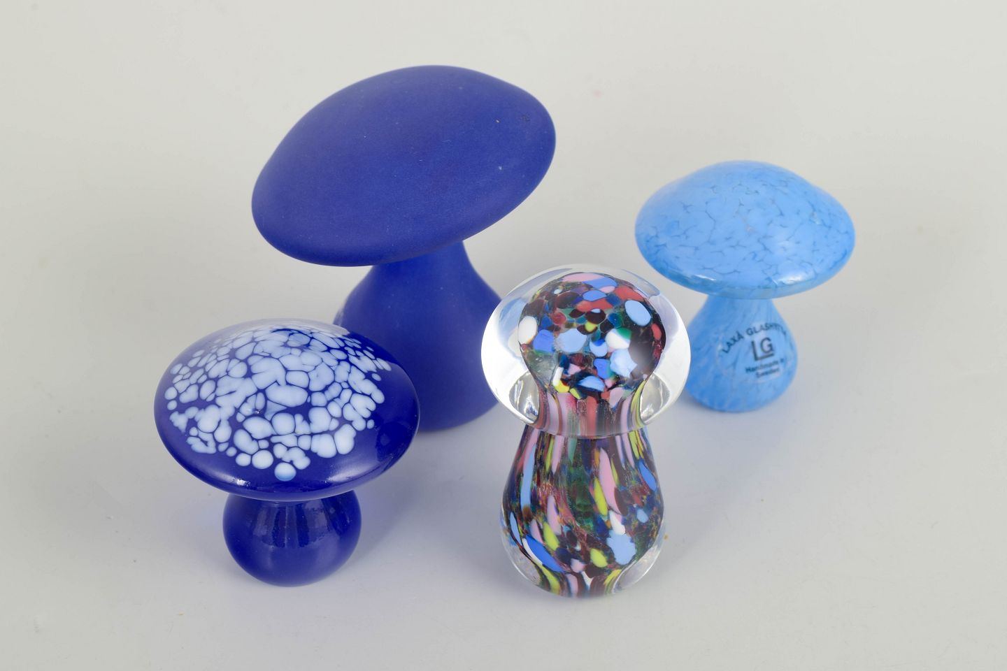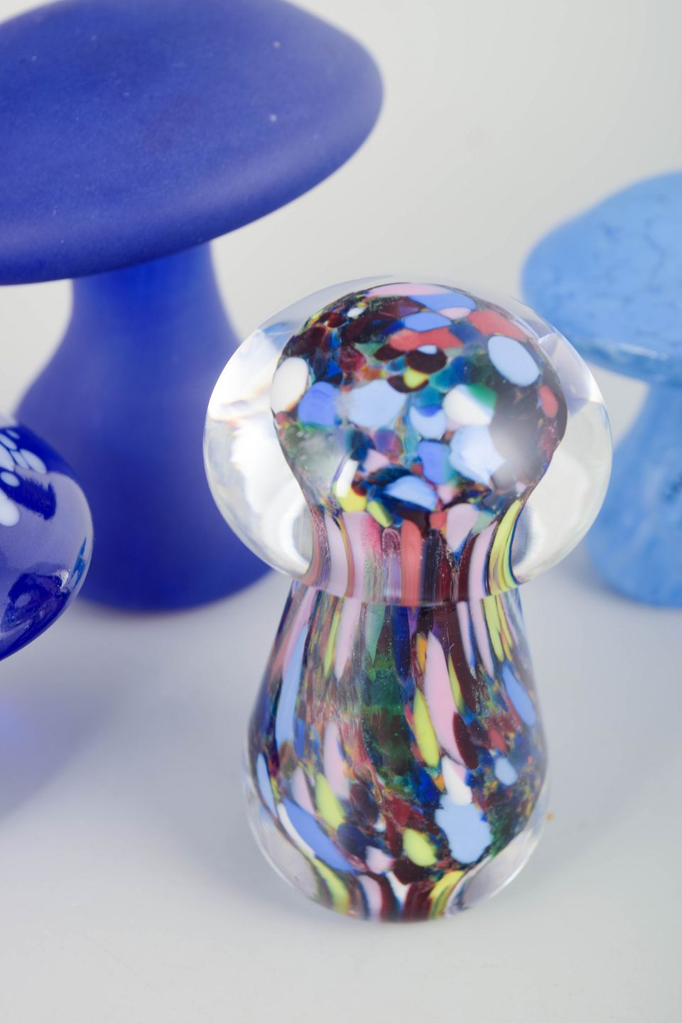 Decorative group of art glass mushrooms in varied shapes and colours, including deep blue, light blue and multicoloured spatter glass. Organic silhouettes with a strong emphasis on colour play and surface effects. Stickers present on some examples.