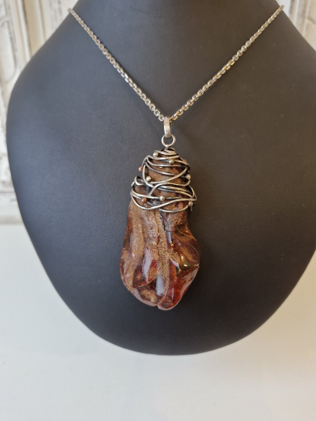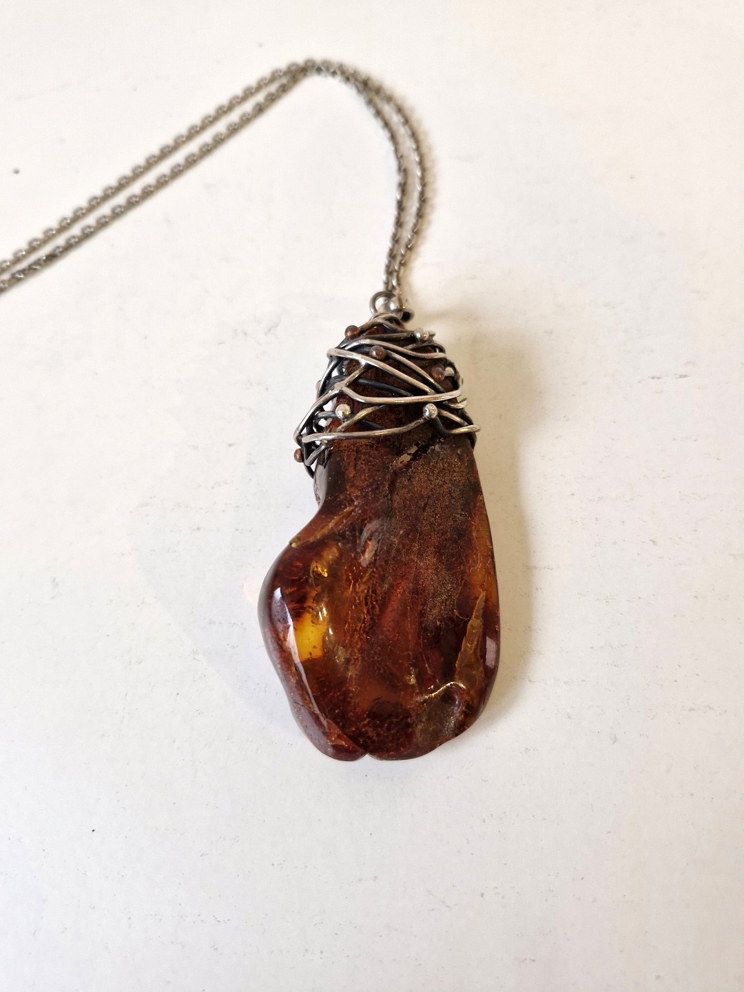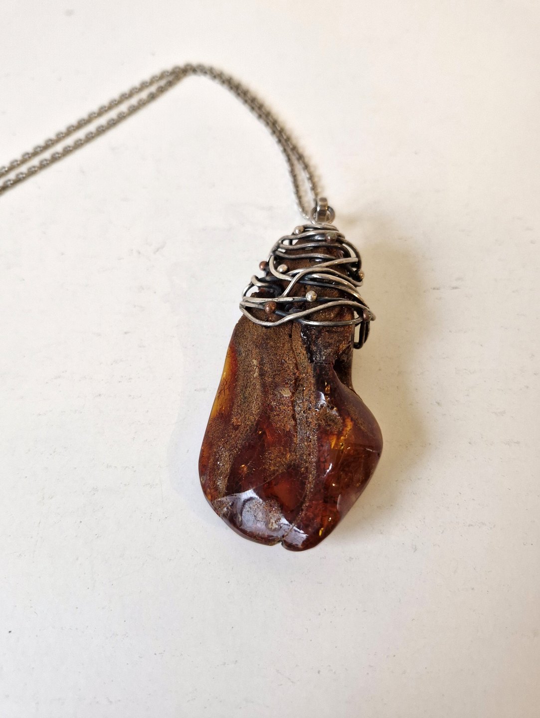 Sølv halskæde med stort ravvedhæng omviklet med sølv tråd