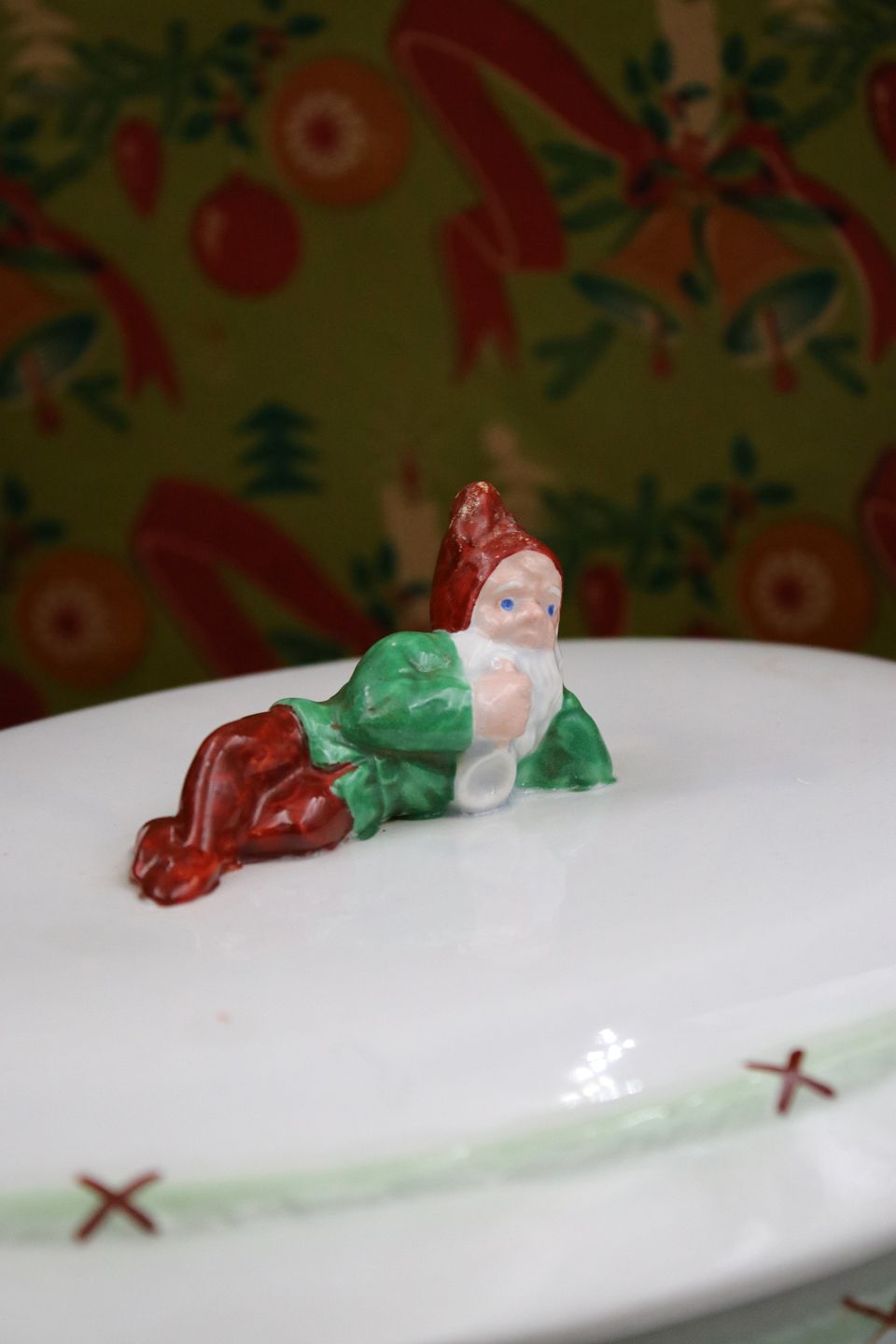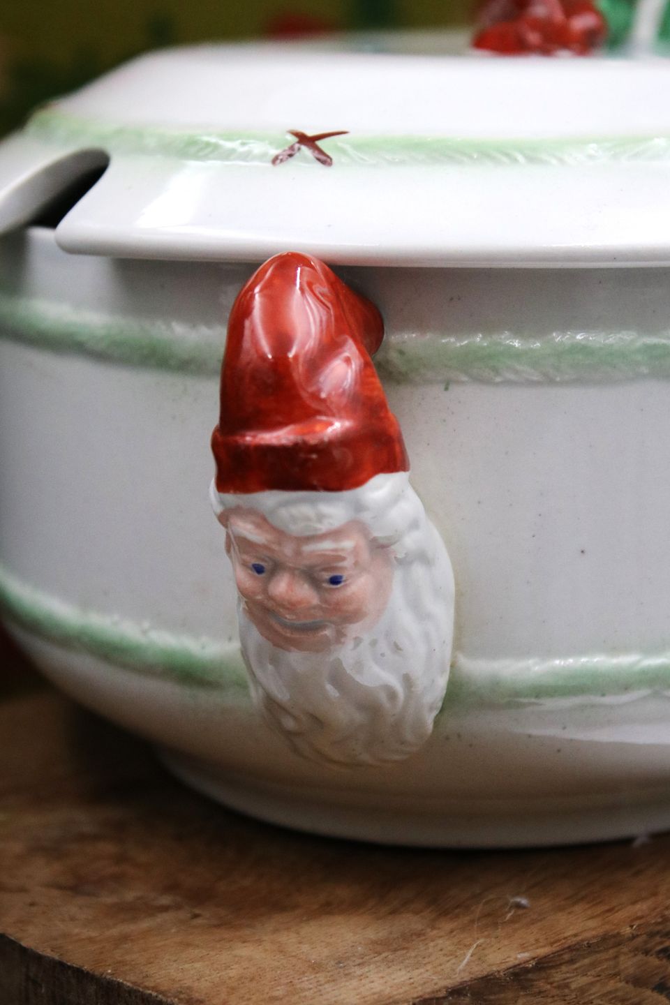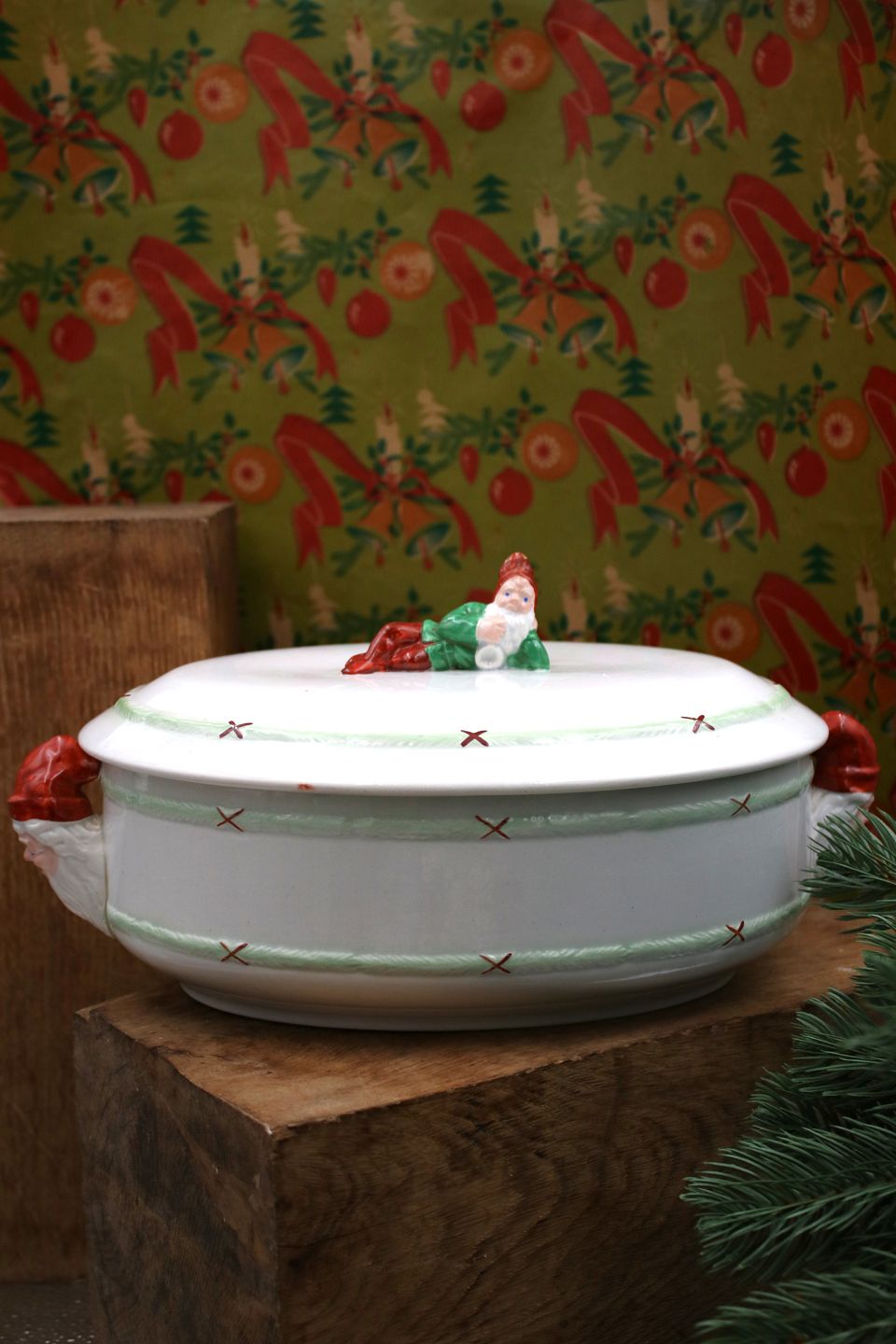 Antik , svensk oval herregårds jule terrin i fajance med farvelagt nisse liggende på toppen af låget...