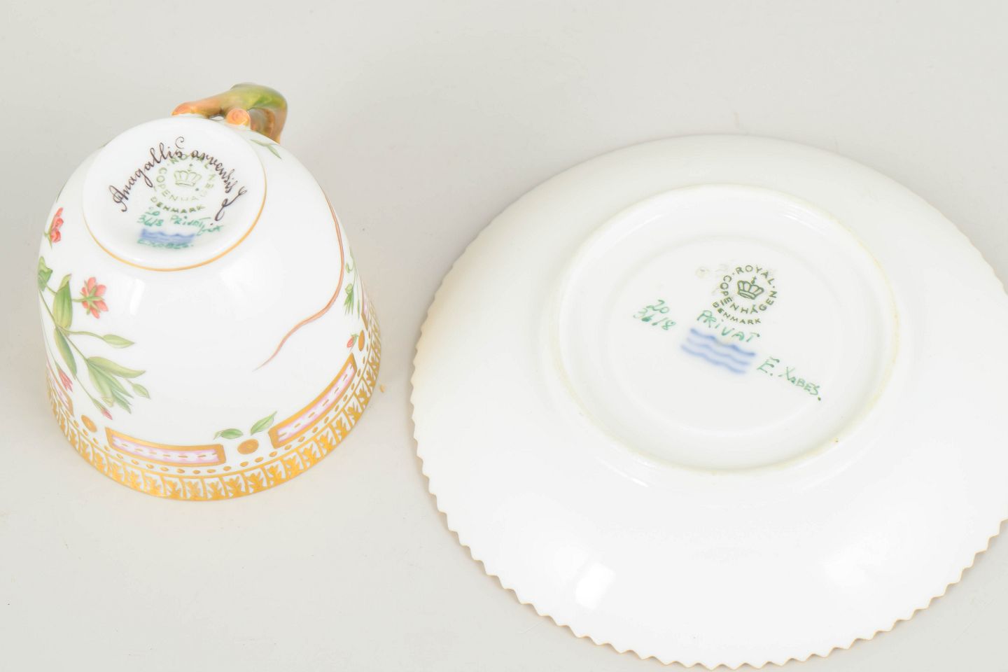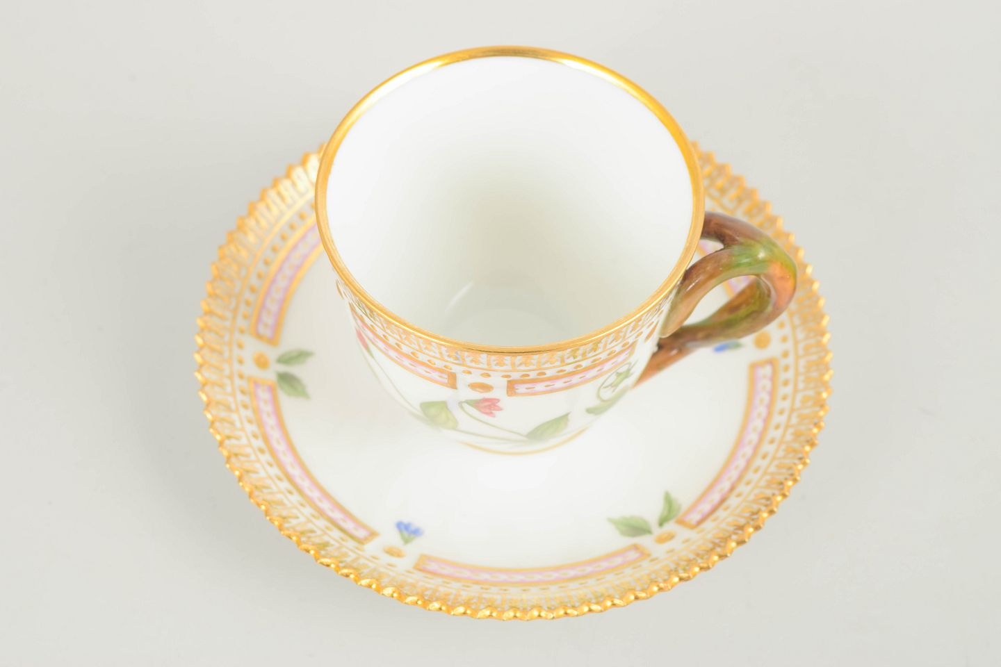 Elegant moccakop med tilhørende underkop i det ikoniske Flora Danica-stel. Koppen er håndmalet med botanisk motiv gengivet efter Flora Danica-værket og udført i stellets karakteristiske, raffinerede formsprog med dekorativ kant. En klassisk og eksklusiv kaffekop.
