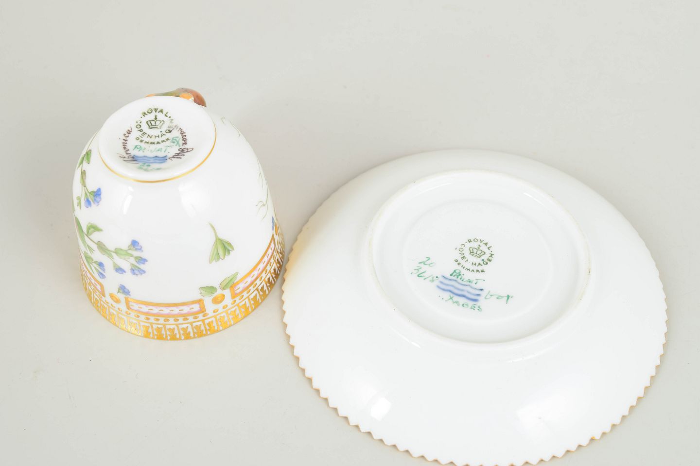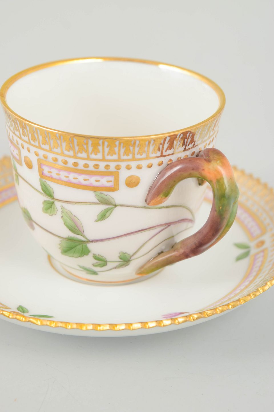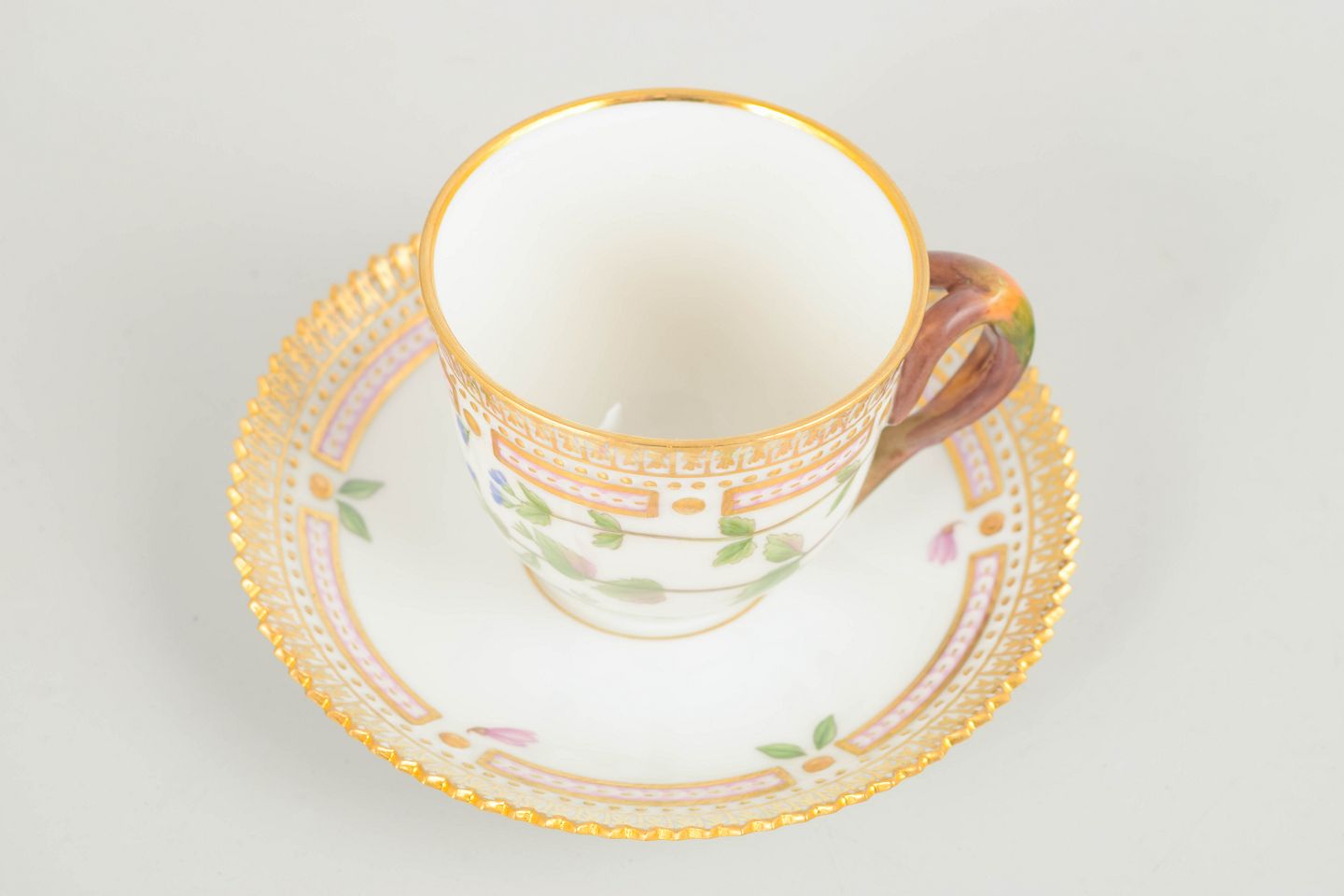 Elegant moccakop med tilhørende underkop i det ikoniske Flora Danica-stel. Koppen er håndmalet med botanisk motiv gengivet efter Flora Danica-værket og udført i stellets karakteristiske, raffinerede formsprog med dekorativ kant. En klassisk og eksklusiv kaffekop.