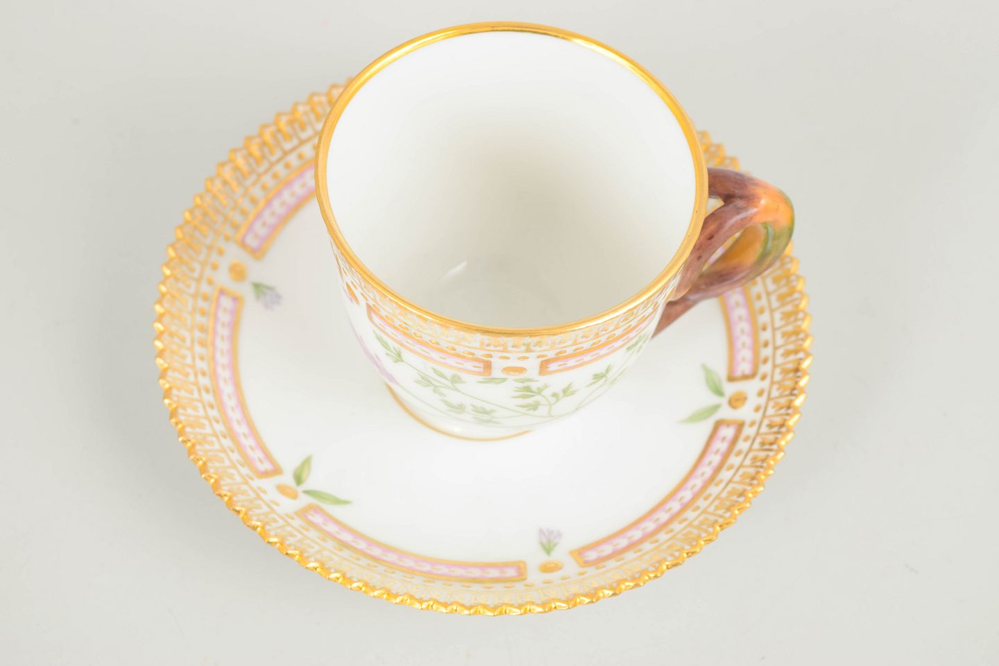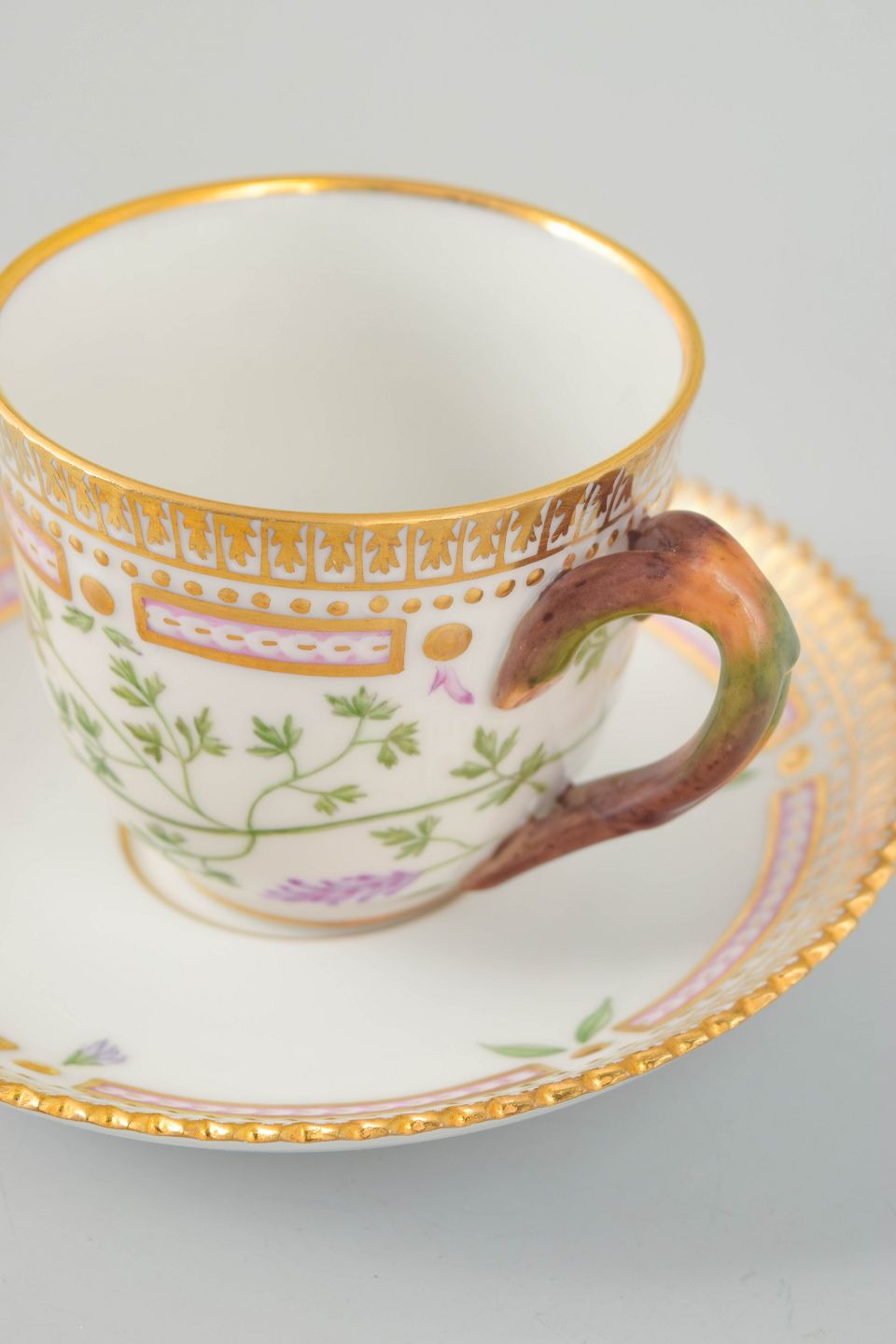 Elegant moccakop med tilhørende underkop i det ikoniske Flora Danica-stel. Koppen er håndmalet med botanisk motiv gengivet efter Flora Danica-værket og udført i stellets karakteristiske, raffinerede formsprog med dekorativ kant. En klassisk og eksklusiv kaffekop.
