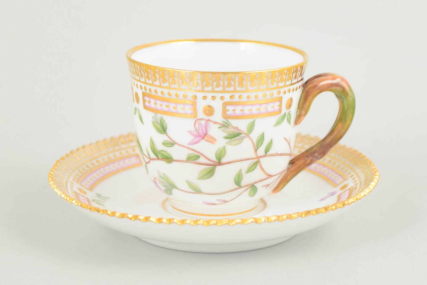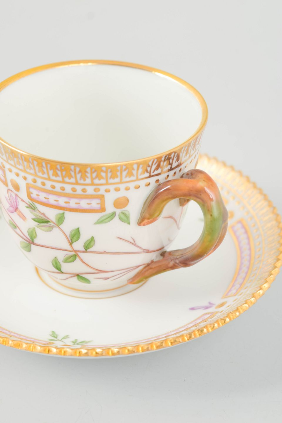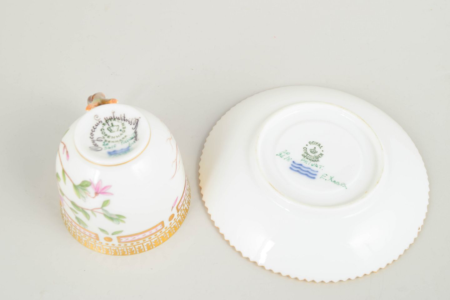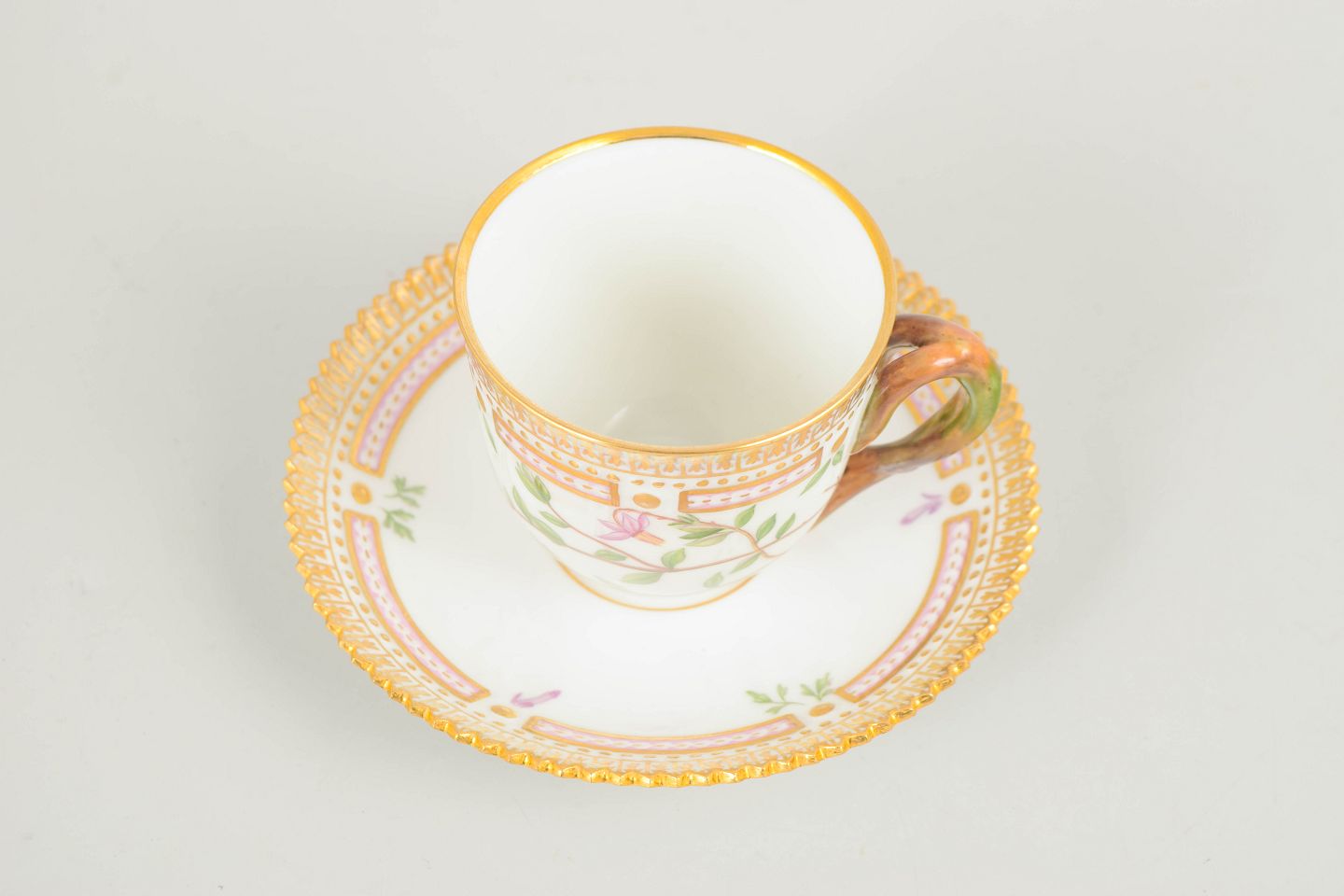 Bio: Flora Danica-stellet blev introduceret i 1790 og regnes blandt Royal Copenhagens mest prestigefyldte produktioner. Dekorationerne er baseret på det monumentale botaniske værk Flora Danica og er kendetegnet ved høj detaljerigdom og fremragende håndværksmæssig kvalitet. Demitassekopper var traditionelt anvendt til servering af stærk kaffe og repræsenterer en raffineret del af det klassiske kaffestel.