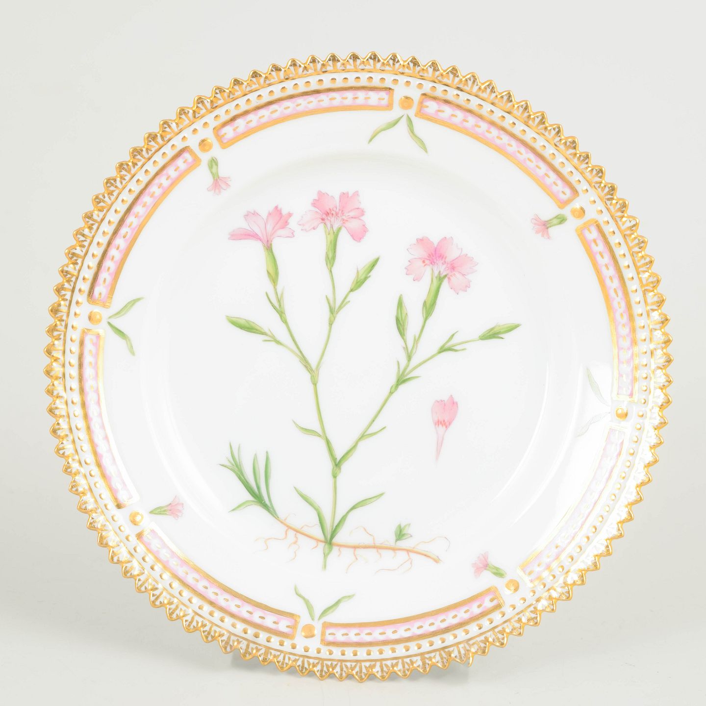 Bio: Flora Danica-stellet blev introduceret i 1790 og regnes blandt Royal Copenhagens mest prestigefyldte produktioner. Dekorationerne er baseret på det monumentale botaniske værk Flora Danica og er kendetegnet ved høj detaljerigdom og fremragende håndværksmæssig kvalitet. Mindre dele som sidetallerkener har traditionelt været anvendt til dessert eller mindre anretninger og er i dag eftertragtede samlerobjekter.