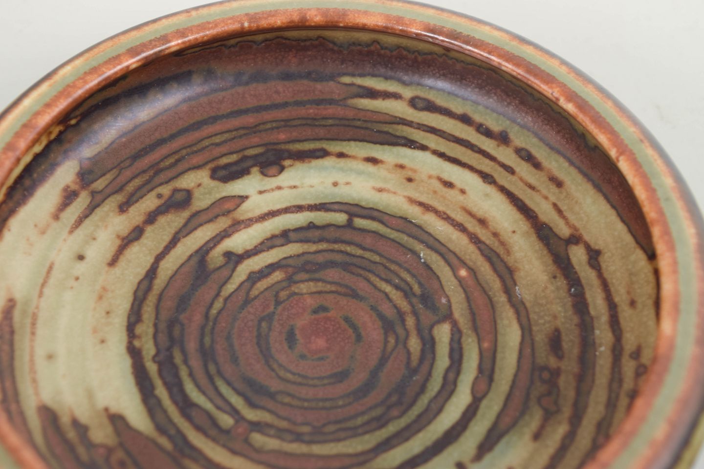 Lav skål udført i stentøj med koncentrisk, cirkulær dekoration og levende glasur i jordfarver med grønne, brune og rustfarvede nuancer. Den enkle, flade form kombineres med et markant grafisk udtryk i glasuren, som giver skålen et stærkt dekorativt præg.