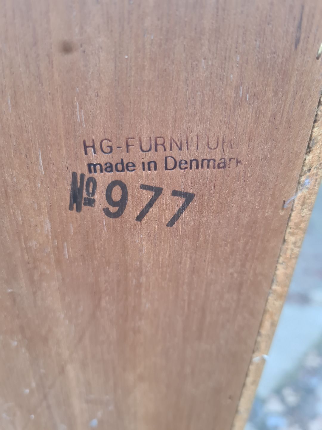 Reol i finéret eg med underskab og hessian beklædt bagbeklædning. Ydført hos HG Funiture i 1970'erne. Fremstår pæn og velholdt uden de store brugsspor.