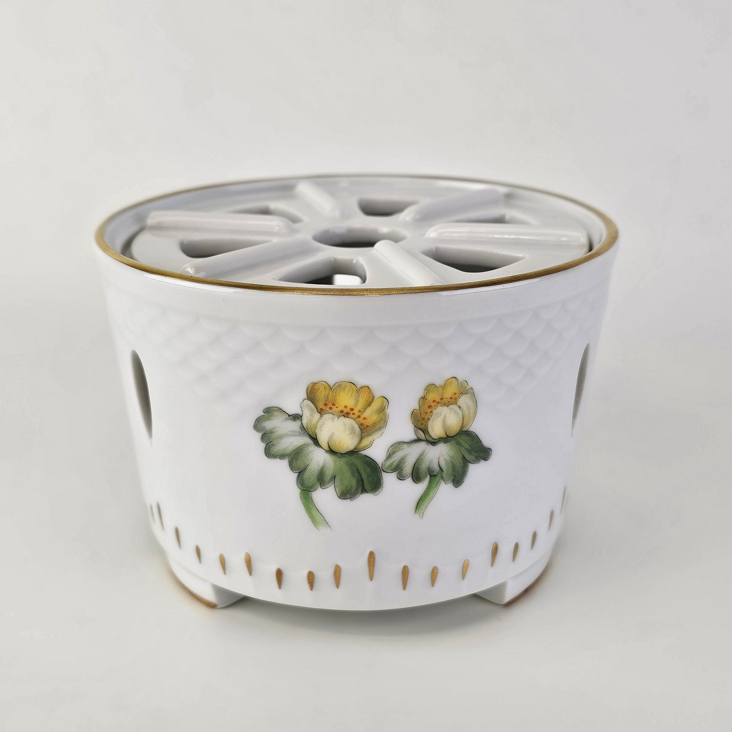 Hvidt porcelæn i skælform med dekoration af gule blomster og guldkant