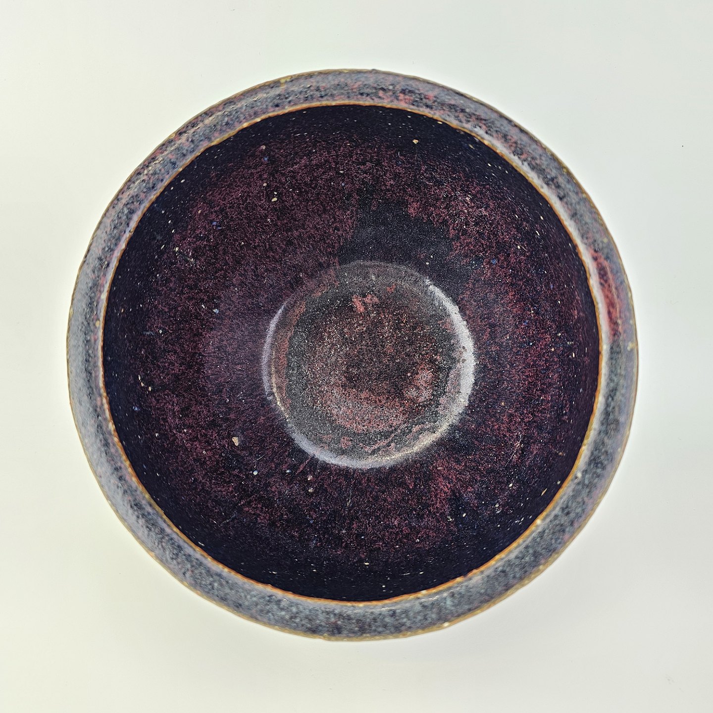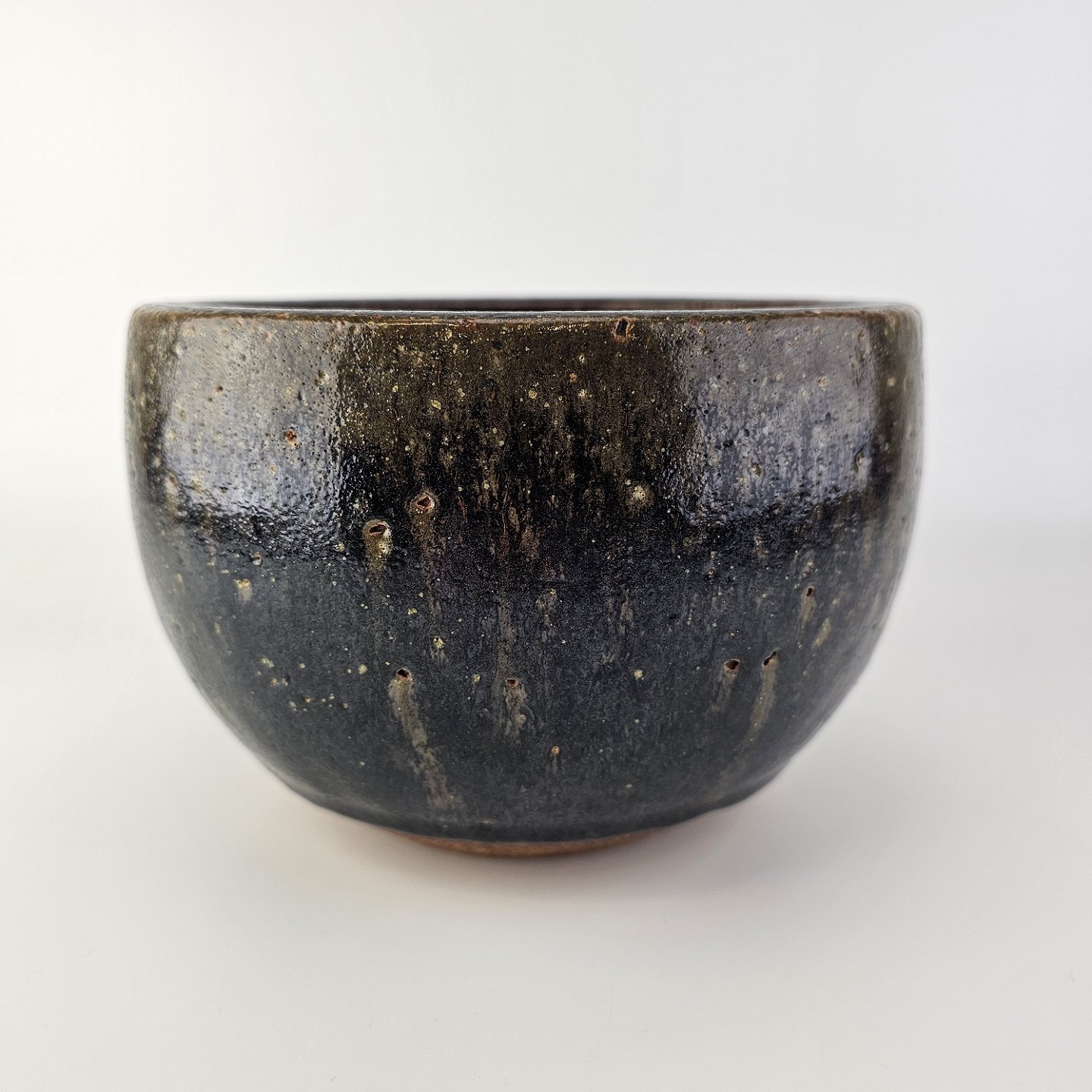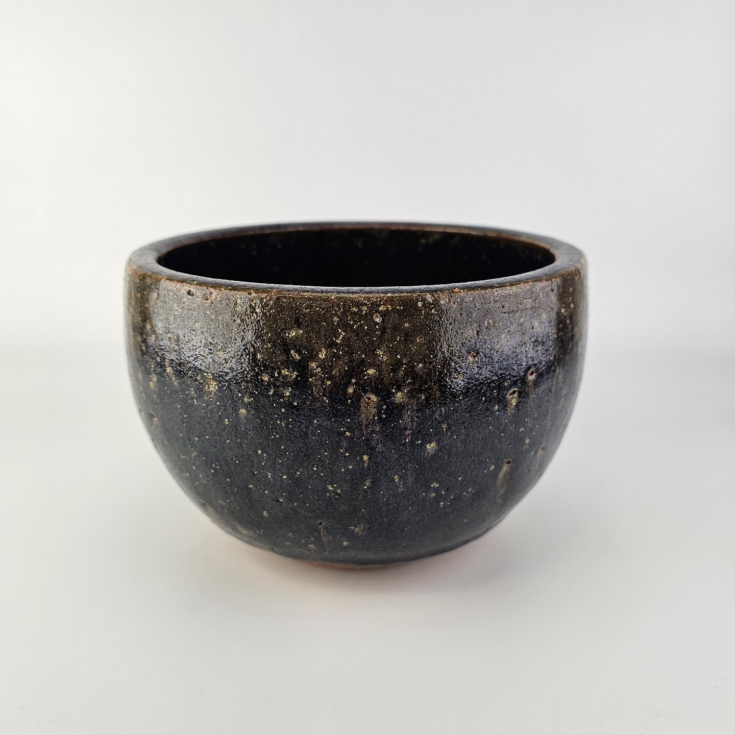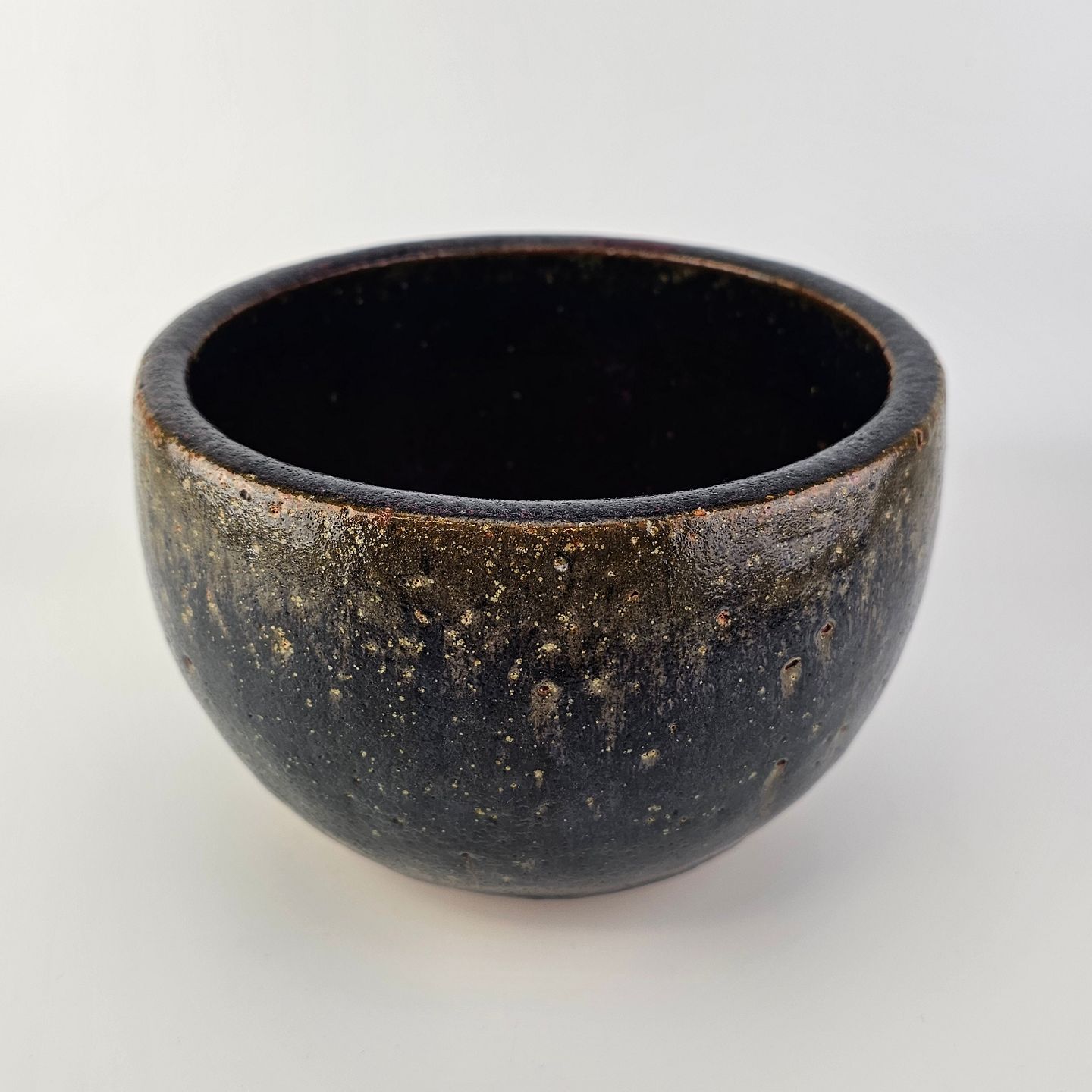 Stentøj skål i sort og grøn glasur, indeni rødlig glasur.