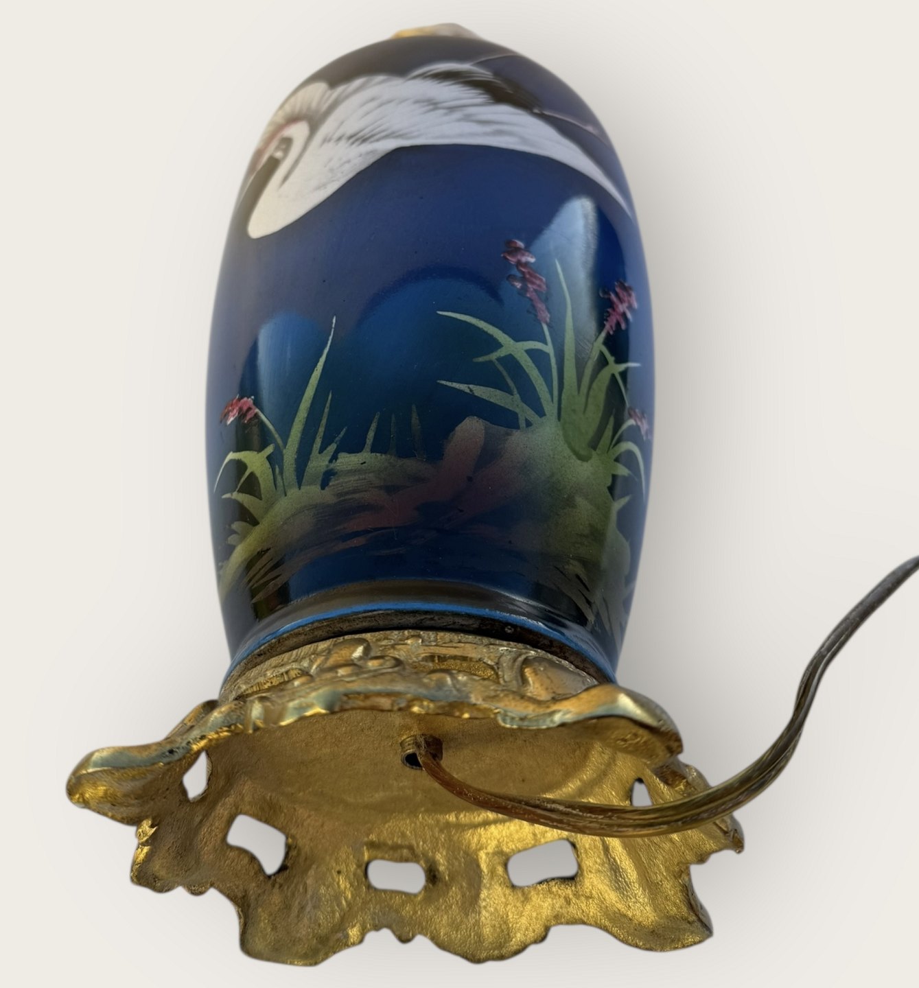 Stor bordlampe med flyvende fugl i porcelæn og messing, højde med fatning 39cm *Enkelte småkrakeleringer under glasuren (se foto) ellers flot stand