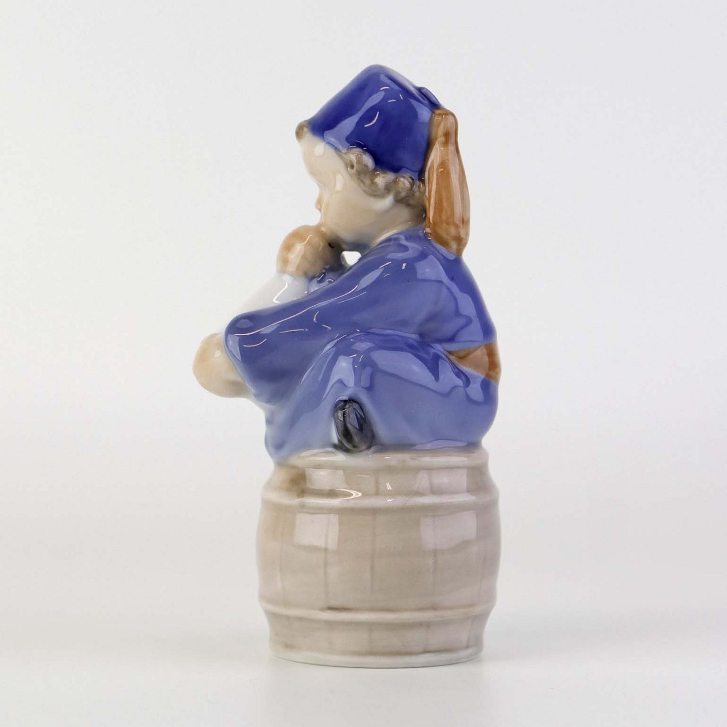 Figur i porcelæn med motiv af siddende dreng på tønde blæsende på et horn. Nr. 3689