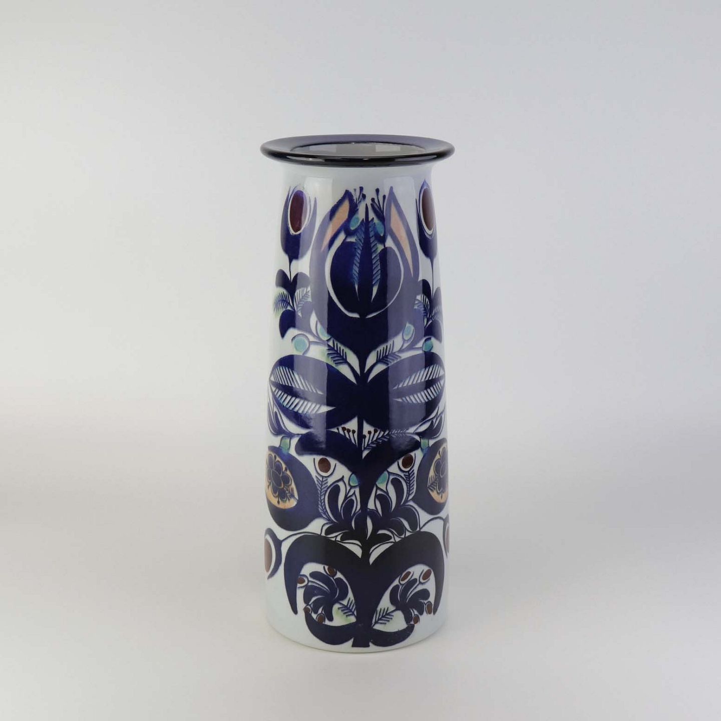 Vase i fajance fra Tenera serien med let krakkeleret glasur og blåt abstrakt blomstermønster. Nr. 207/2967