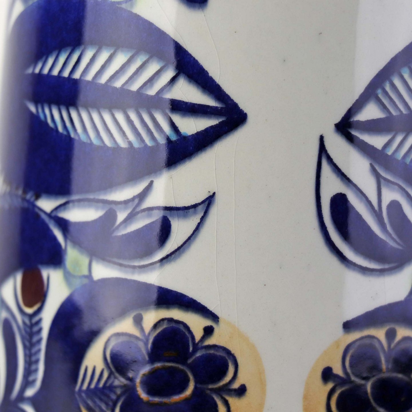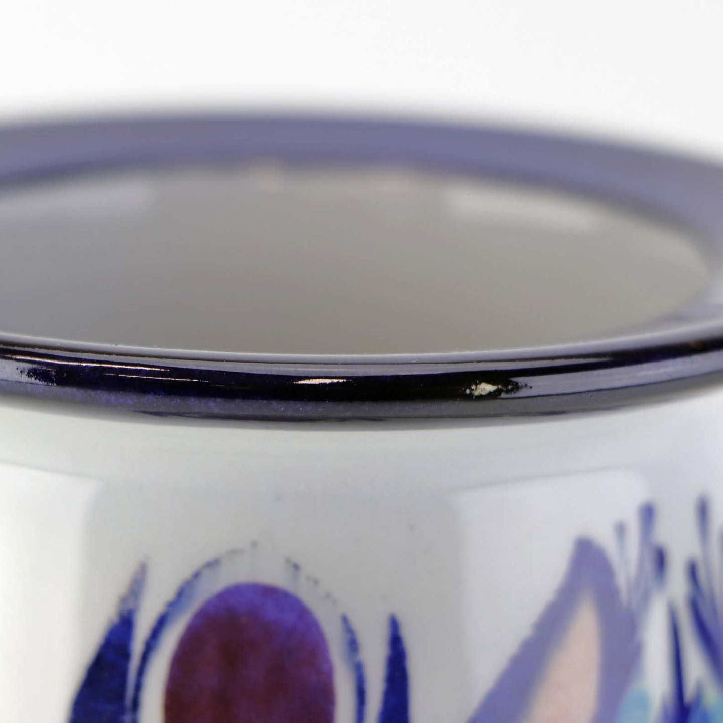 Fremstår med enkelte mindre ridser i glasuren samt en mindre fejl i glasuren ved topkanten.