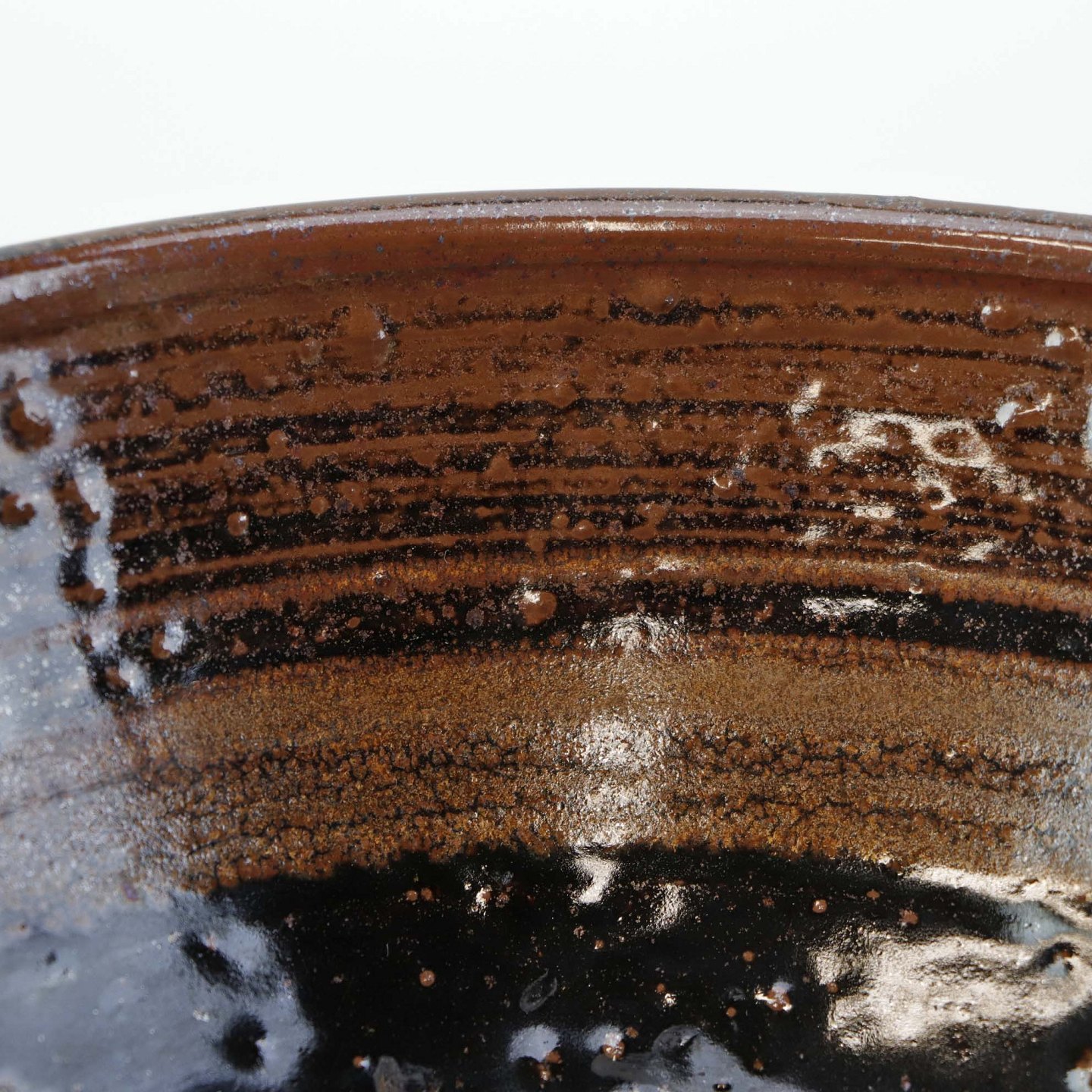 Skål i stentøj med delvist nubret glasur i brunlige nuancer og cirkelformet mønster i bunden.