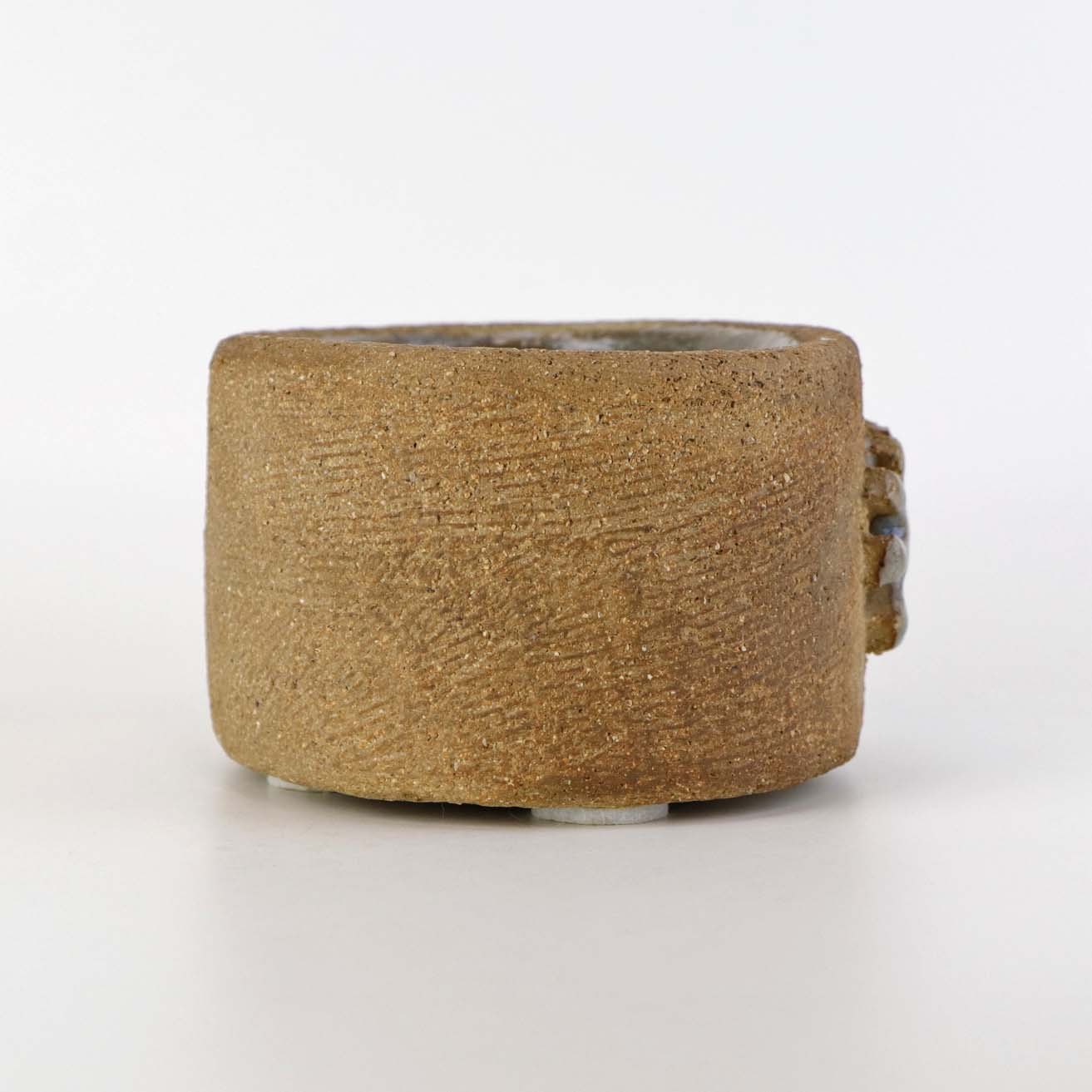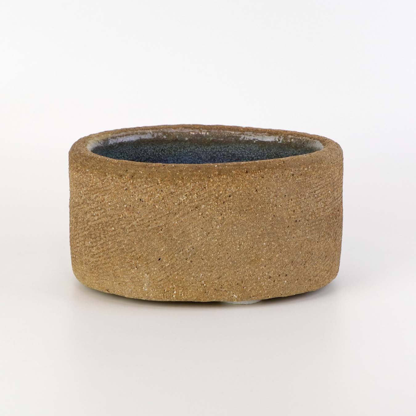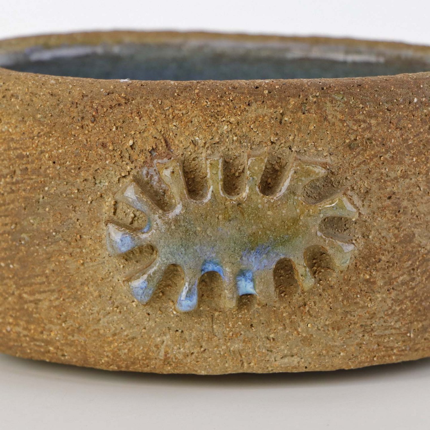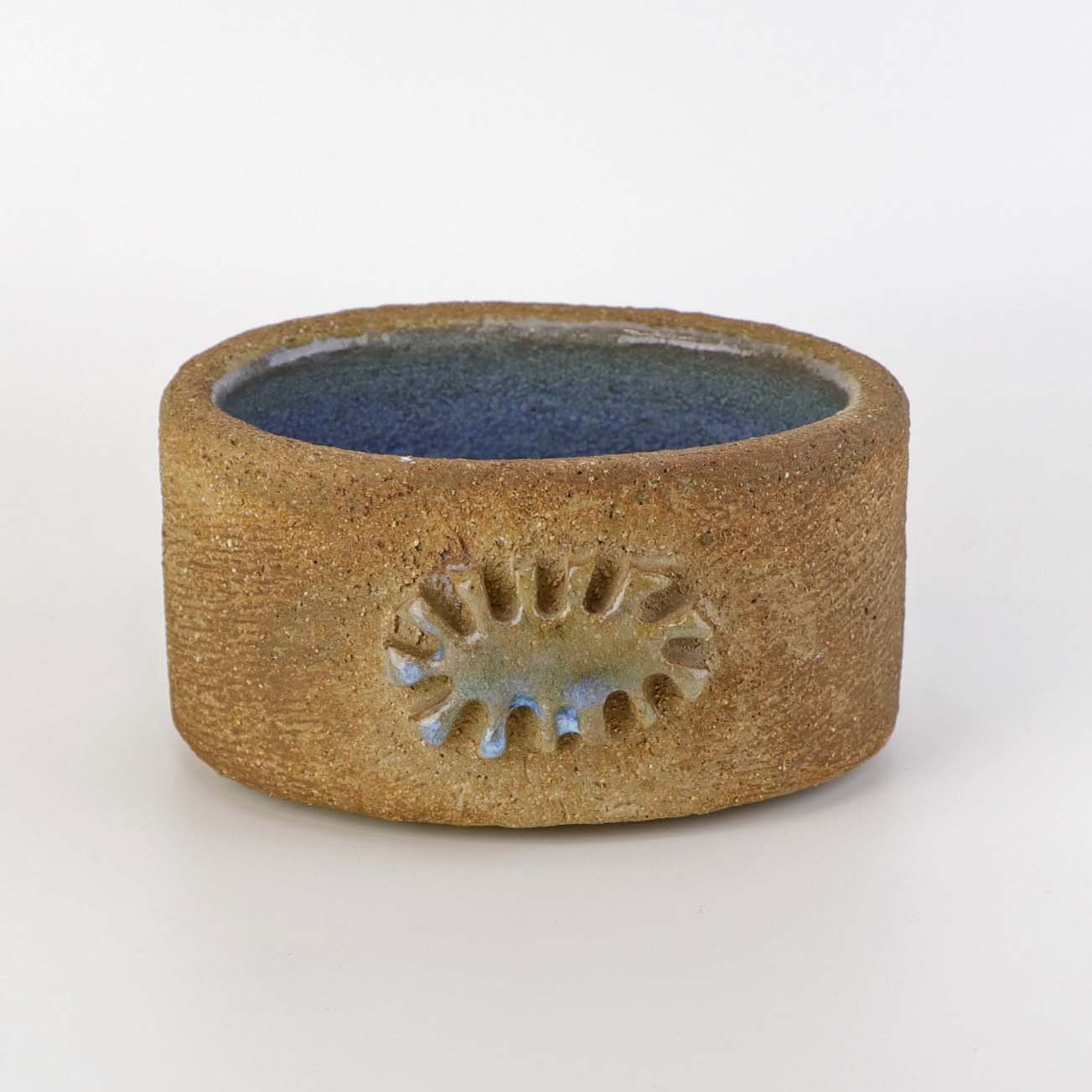 Lille oval skål i keramik med lysblå glasur på indersiden samt delvist glaseret sol mønster på ydersiden.