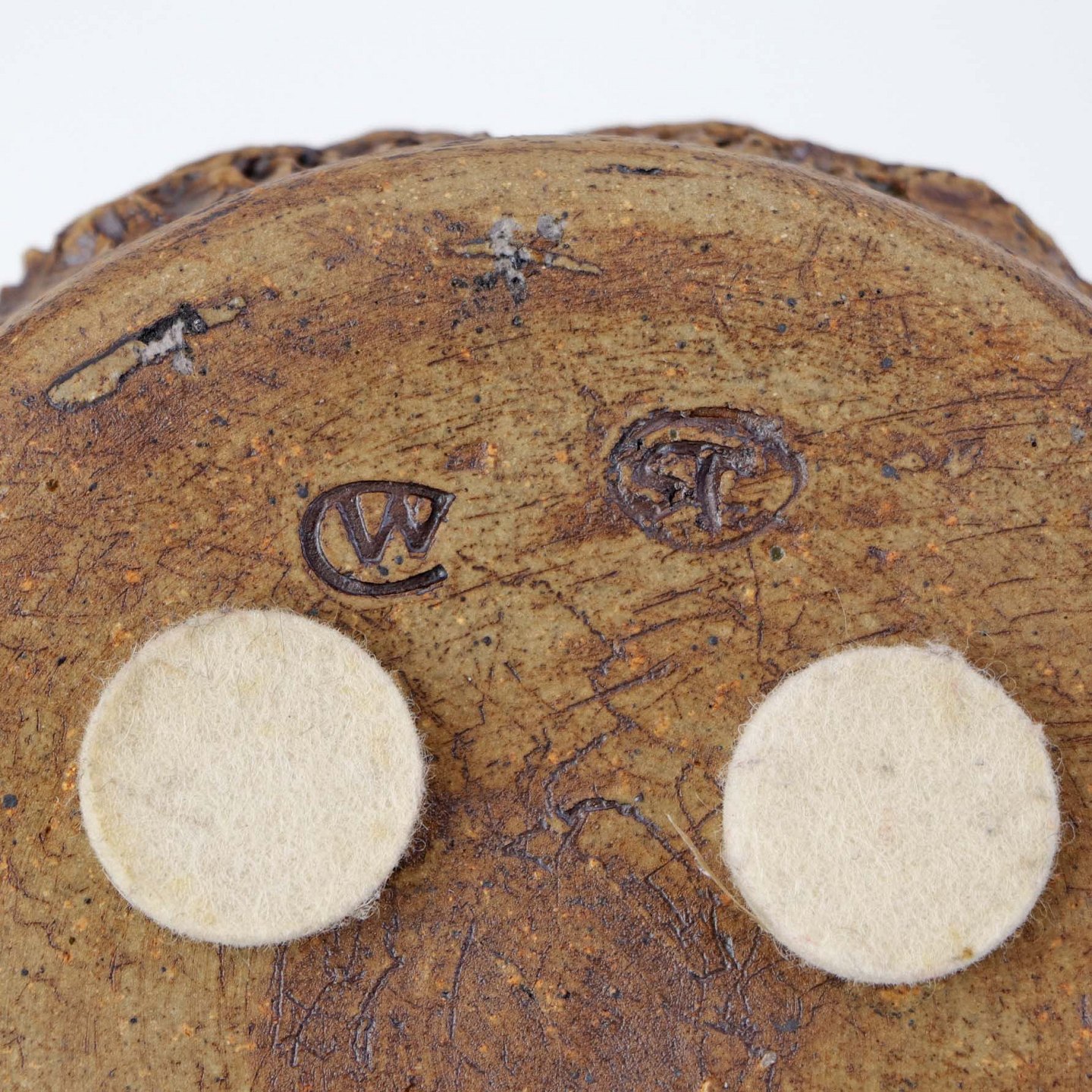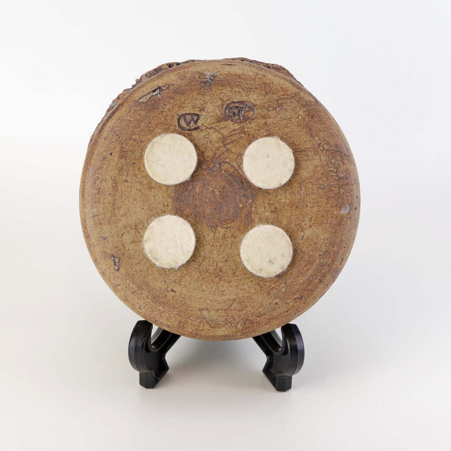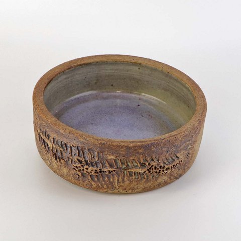 Rund skål i keramik med beige, grå og lyseblå glasur på indersiden samt uglaseret abstrakt mønster på ydersiden.