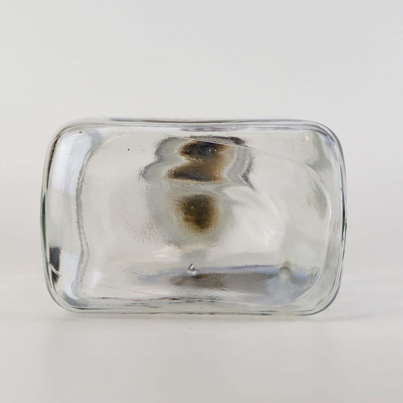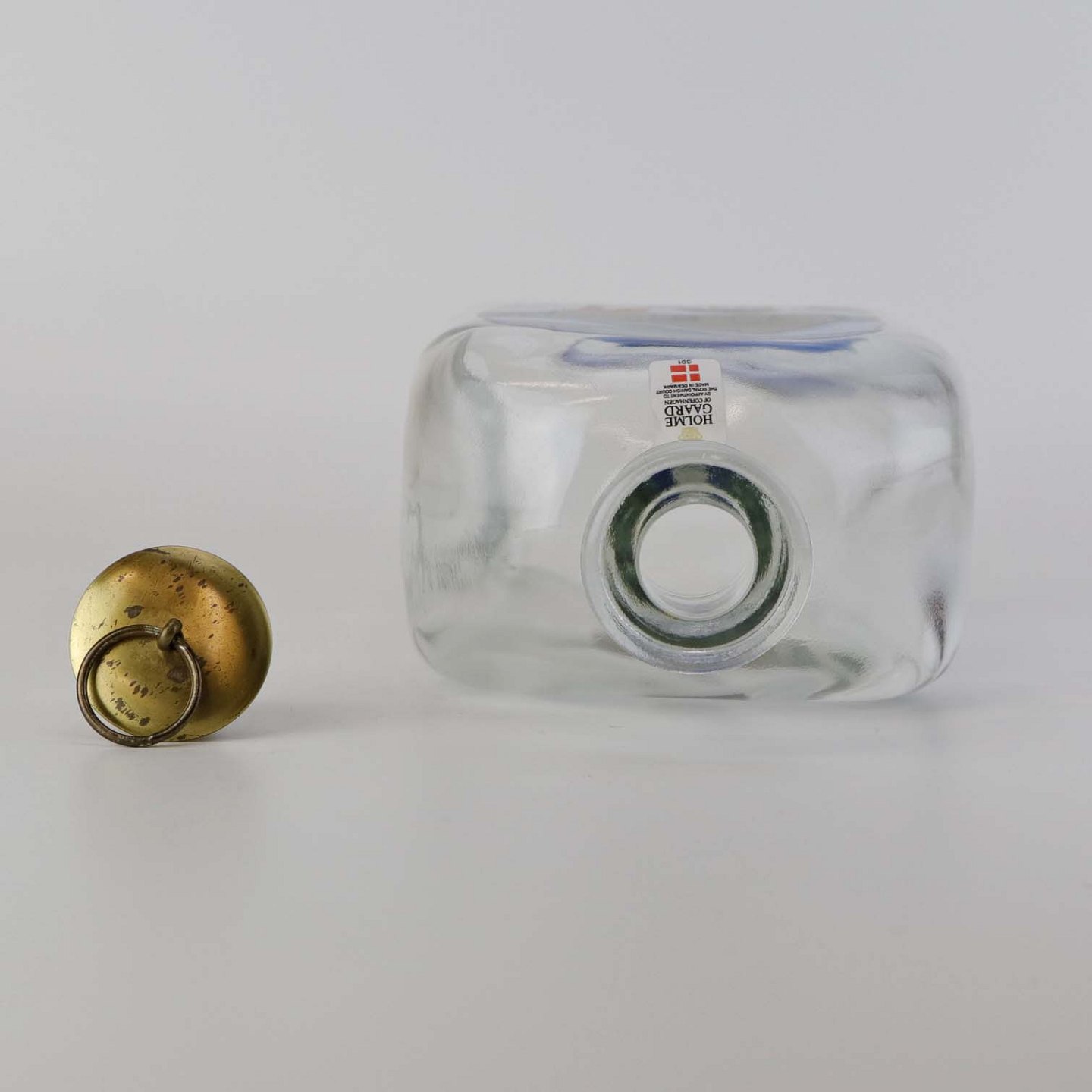 Dramflaske i glas med julemotiv af Nisse, hund og ræv efter tegning af Harald Wibergs. Snapseflasken kommer med korkprop.