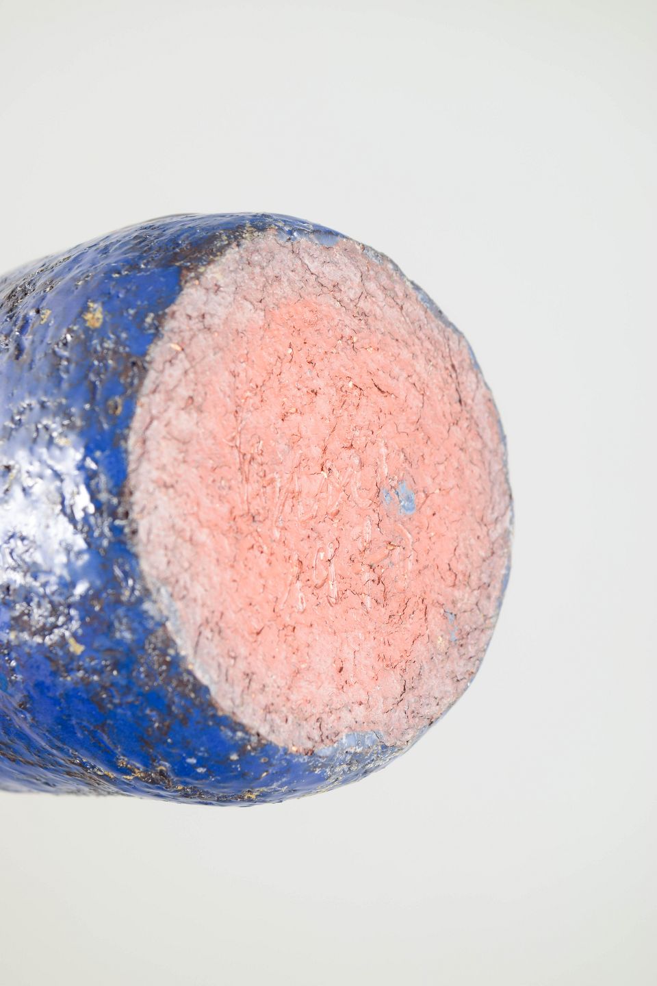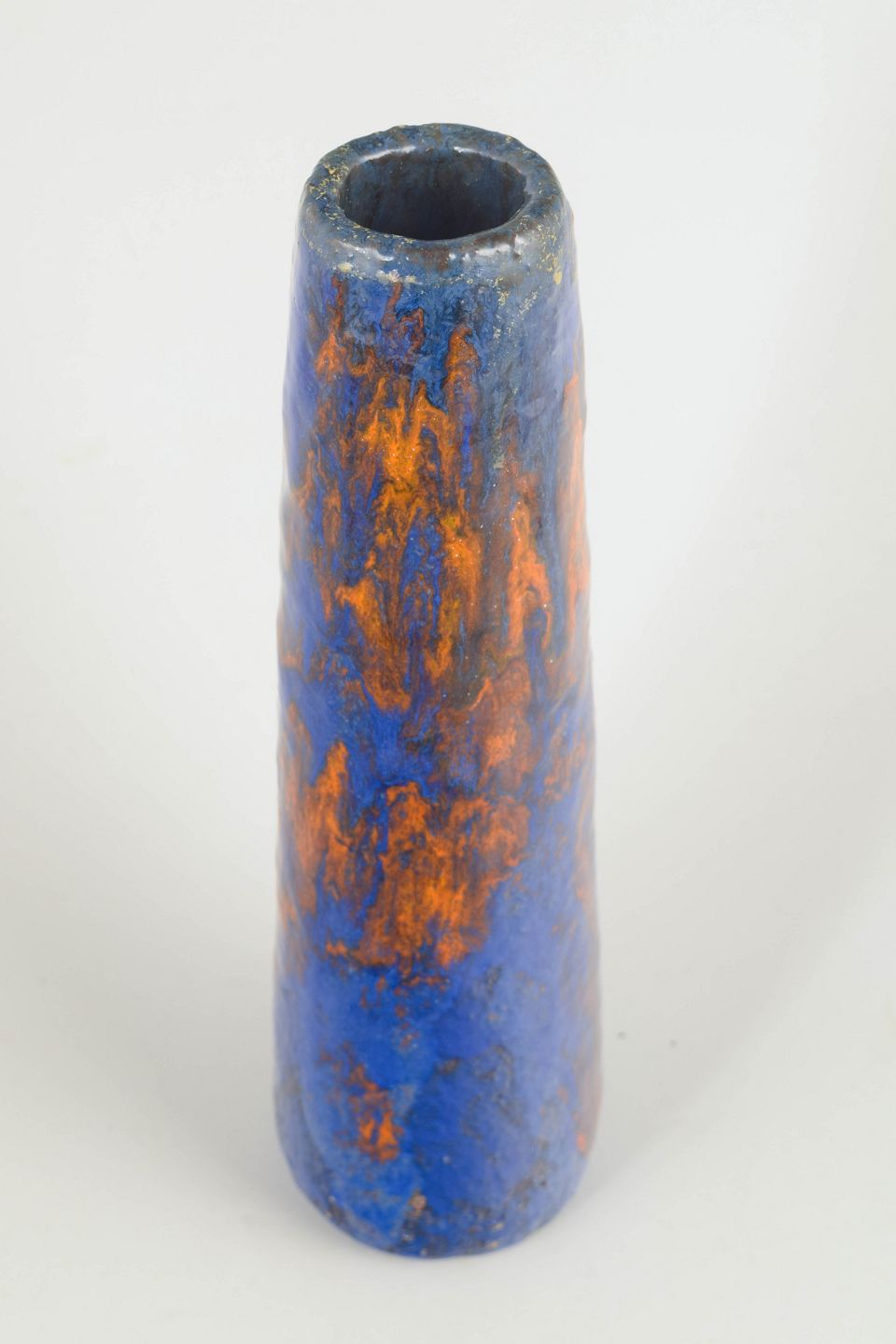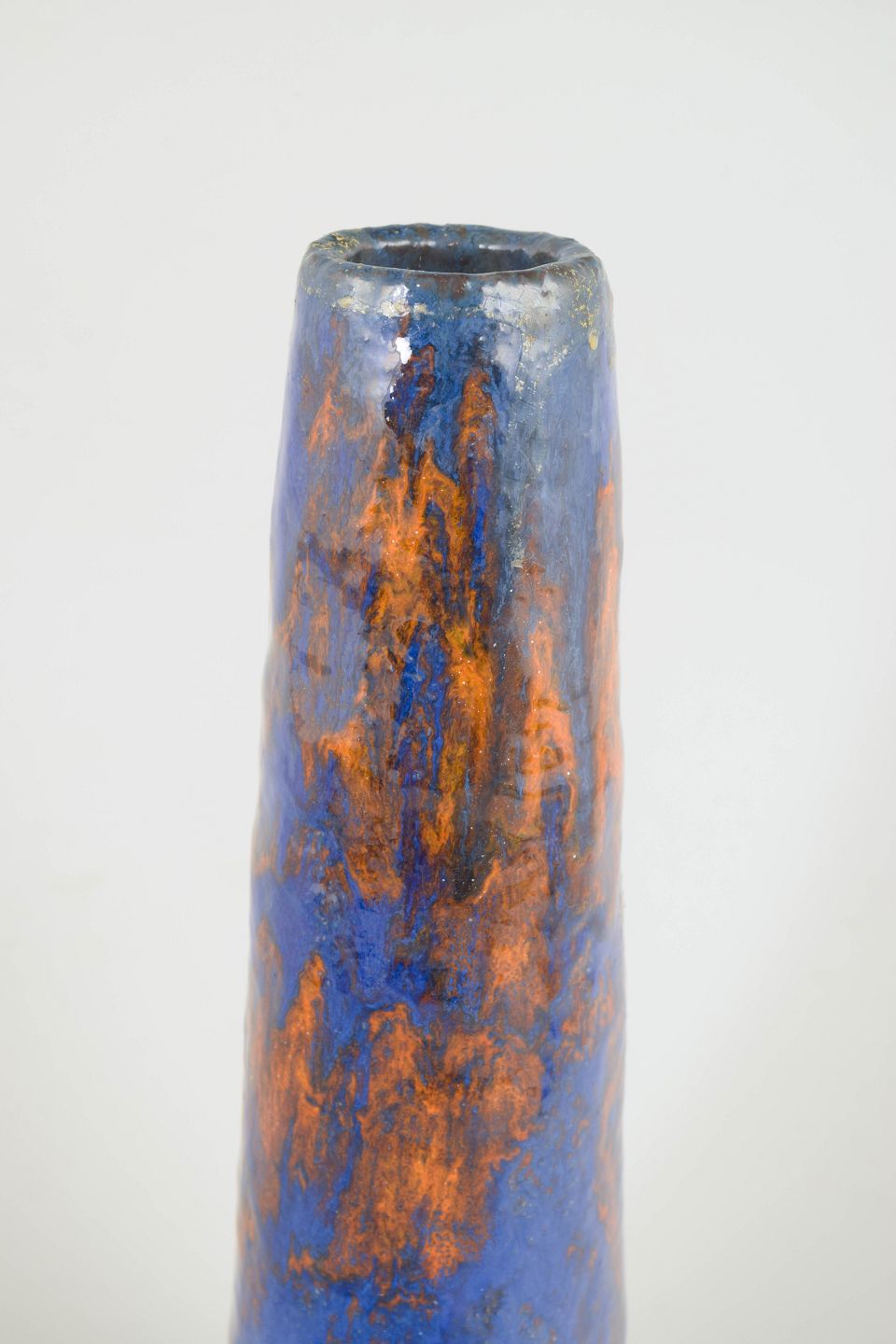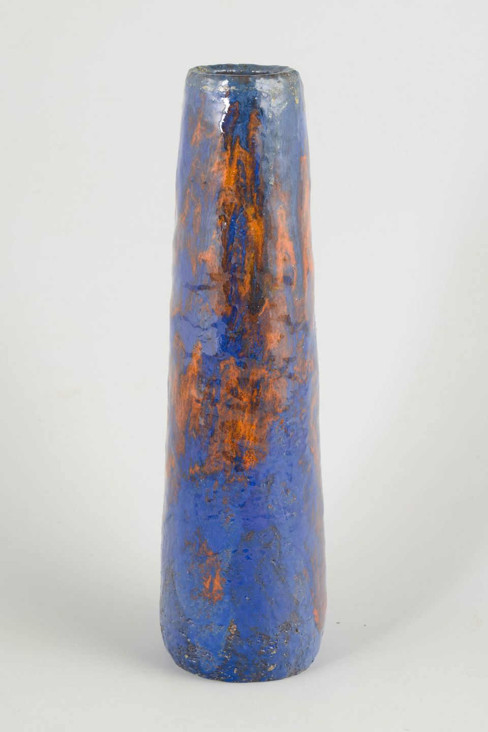 Meget høj og slank vase udført i stentøj med sjælden og eksperimenterende overfladeteknik. Glasuren fremstår i dybe blå nuancer med kraftige, lodrette gennemløb i varme rust- og jordtoner, hvilket skaber et markant og dynamisk udtryk. Den stramme form understreger værkets skulpturelle karakter.