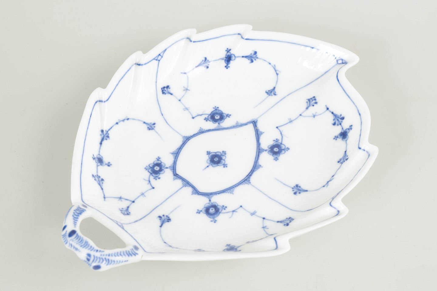 Tidligt antikt serveringsfad udført i Musselmalet riflet med håndmalet koboltblå underglasurdekoration på riflede porcelænsformer. Fadet er bladformet med let bølget kant og integreret greb, en form der var populær i midten af 1800-tallet til servering af mindre anretninger. Udført i 1. sortering.
