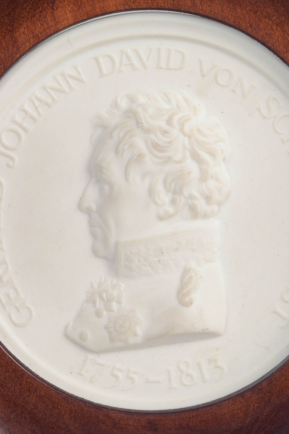 Rund reliefplakette i hvid biscuit porcelæn med klassisk profilportræt og cirkulær inskription, monteret i bred, rund træramme. Udført som en medalje lignende, neoklassisk komposition, hvor den matte biscuit overflade fremhæver portrættets fine modellering og historiske karakter.