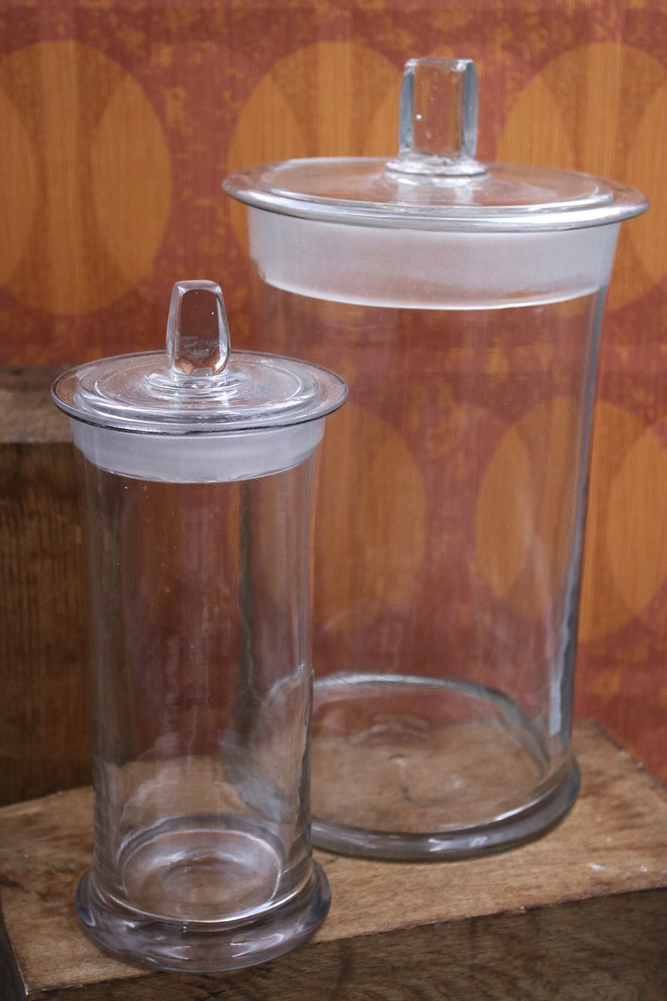 Antique French candy jars "pot a bonbon" in mouth-blown glass with lid and fine knob...