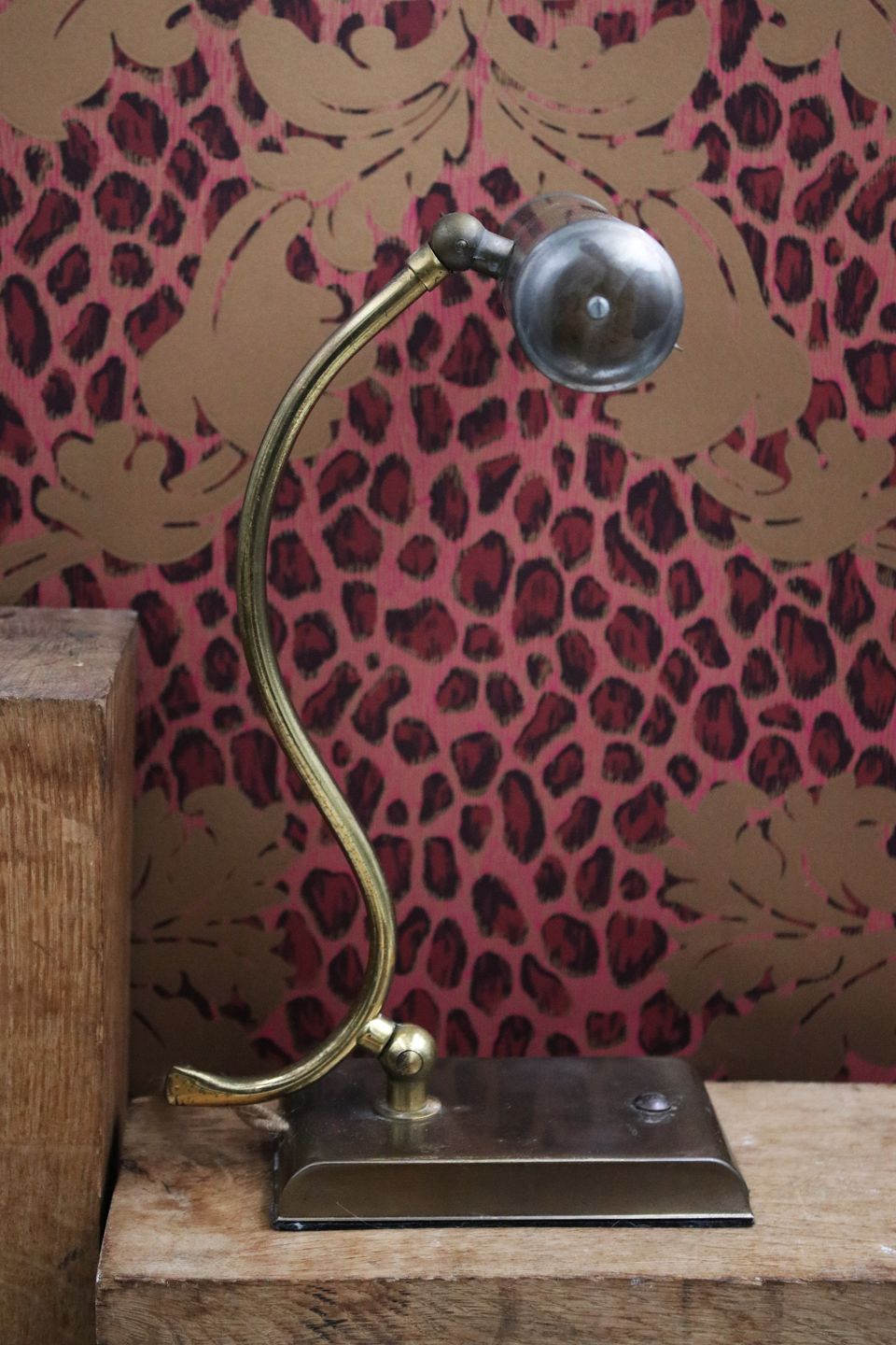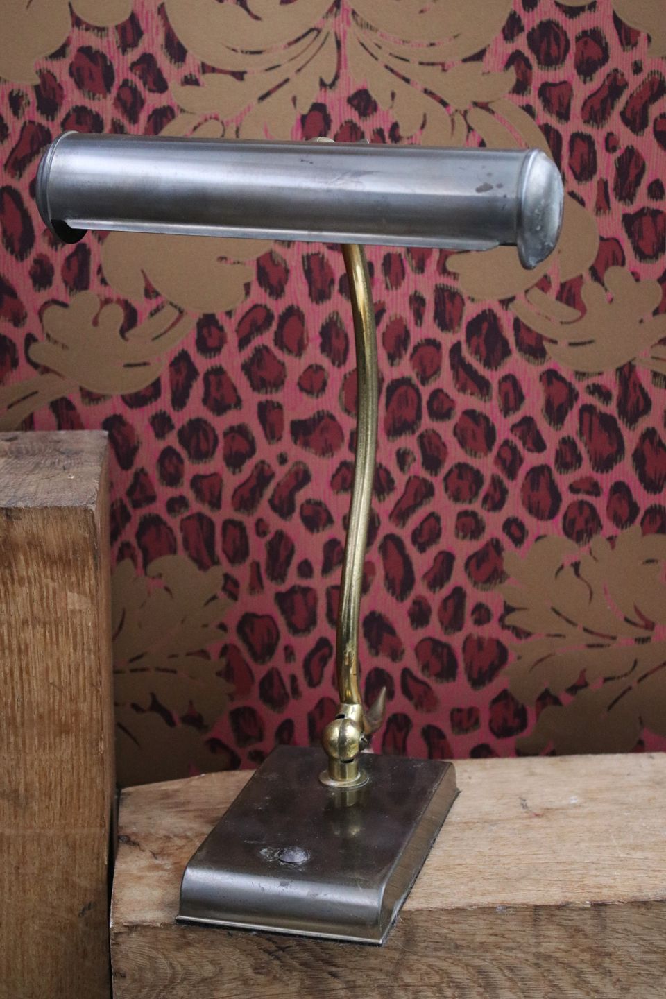 Gammel skrivebordslampe i patineret messing.