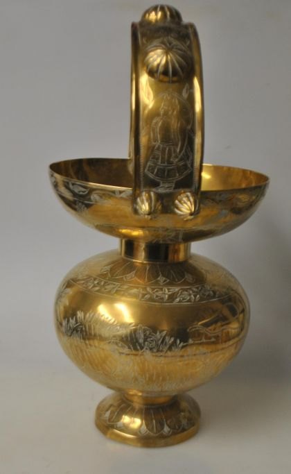 Stor indisk messing vase med hank, ca. 1950. Med indgraverede dekorationer af jagtselskab på elefanter på tiger jagt. På siden ses 4 tigre. Desuden indgraverede blomstermotiver. 32 cm. H.: 21 cm.