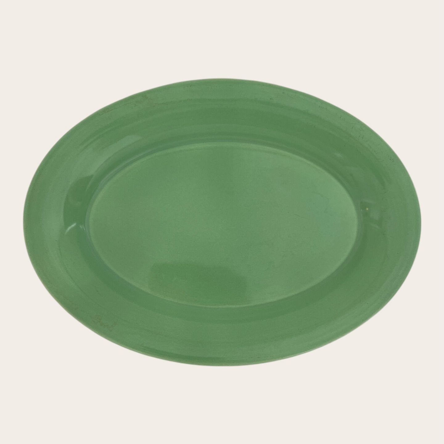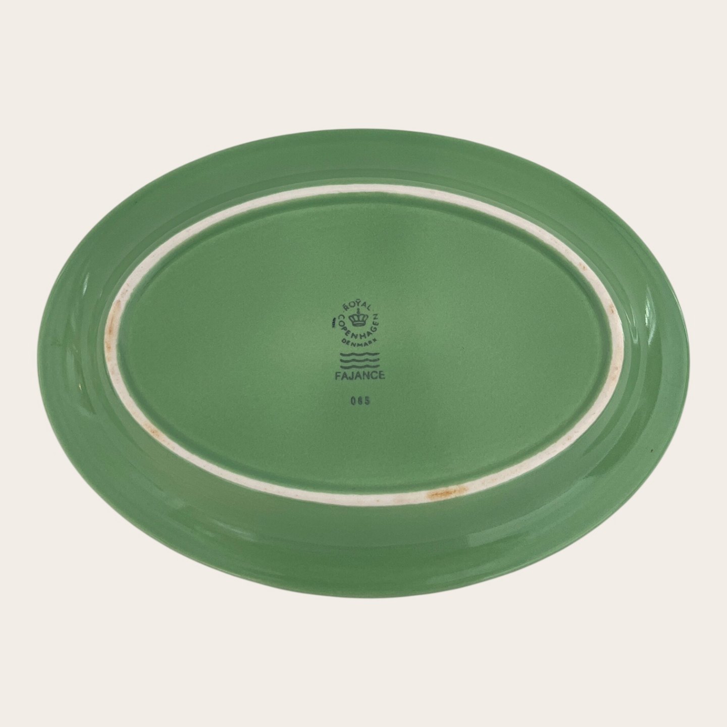 Royal Copenhagen, Aluminia, Tallerken, Lys grøn #085, 1. sortering, 22cm lang, 16cm bred, design Ursula Munch Petersen *Pæn stand*