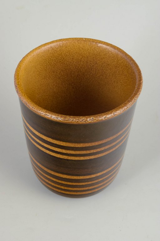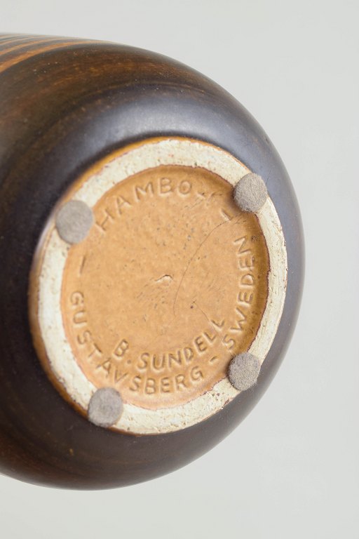Dekorativ vase i glaseret fajance med stiliseret, hånddekoreret motiv, typisk for Britt-Louise Sundells arbejde for Gustavsberg i 1960’erne. Formen er enkel og harmonisk med fokus på overfladedekoration og farvespil, i tråd med periodens svenske modernisme.