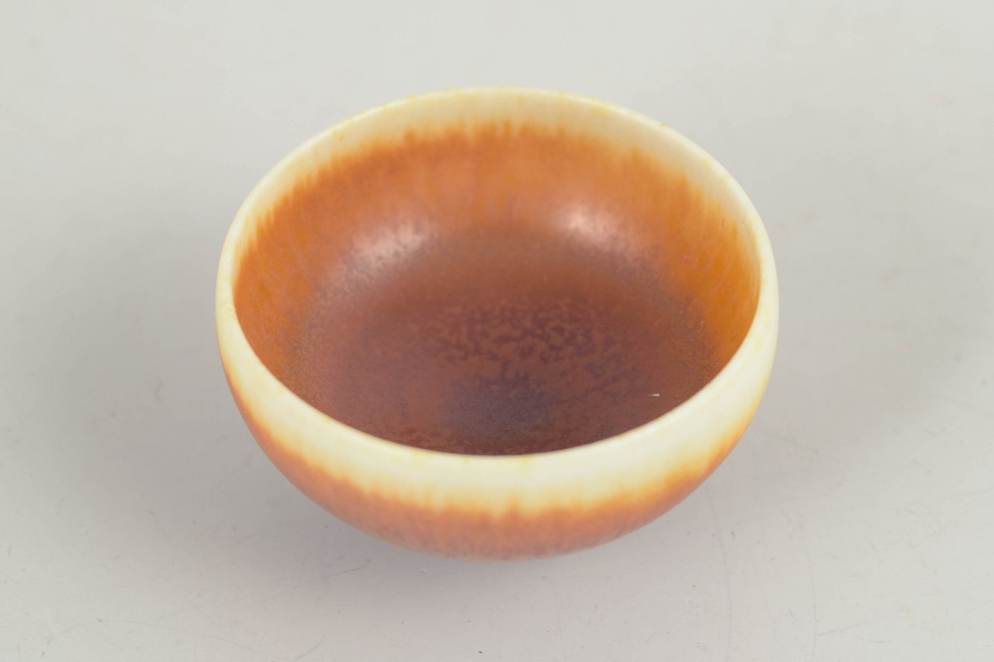 Miniature skål i drejet stentøj med fin, balanceret form og karakteristisk glasur i varme nuancer af brun og creme. En lille, raffineret genstand udført med stor præcision, typisk for Berndt Fribergs arbejder i midten af det 20. århundrede.