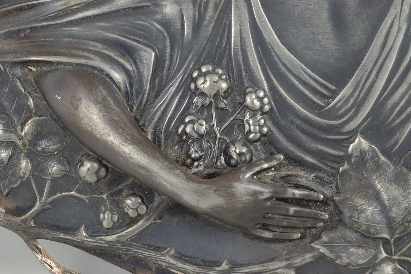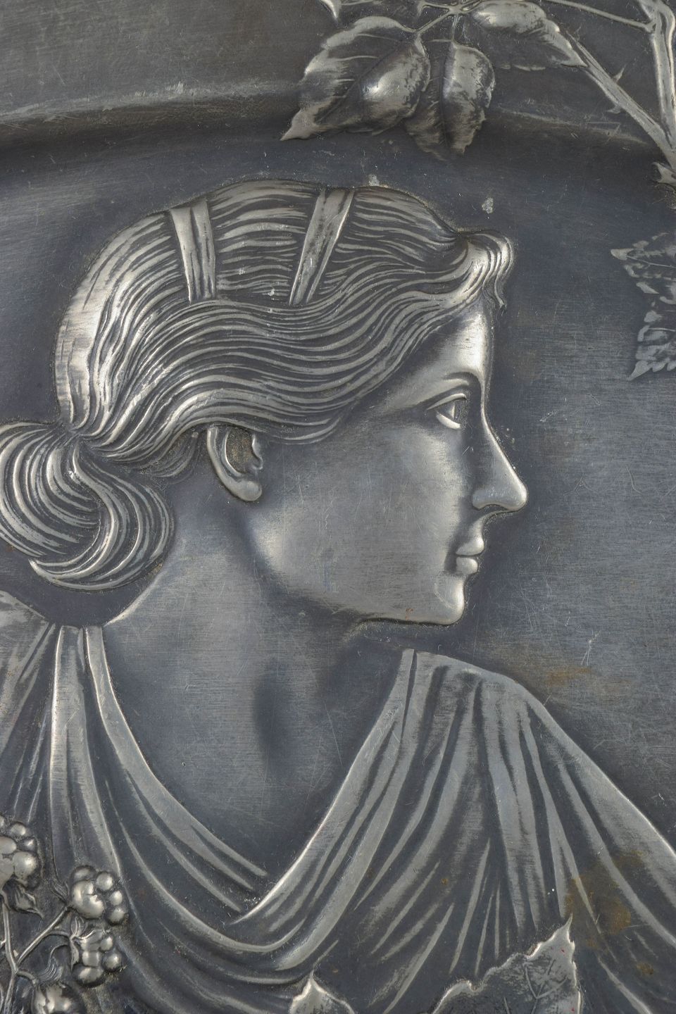Stort ovalt fad i sølvfarvet metal med reliefdekoration i klassisk jugendstil, forestillende en kvindefigur omgivet af slyngende blomster og blade. Elegant, skulpturel komposition med fine detaljer og blød linjeføring, karakteristisk for WMF’s produktion i perioden. Kan anvendes både som serveringsfad og som vægophæng. Signatur forekommer, men er ikke tydeligt læsbar.
