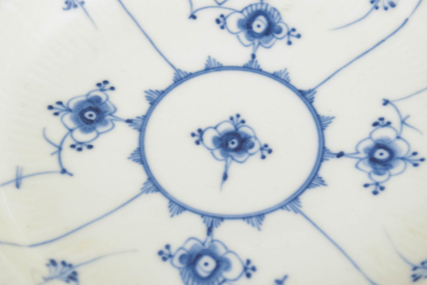 To dybe tallerkener i håndmalet porcelæn med klassisk Musselmalet dekoration i underglasurblå. Det karakteristiske riflede porcelæn og det detaljerede blomster- og rankemotiv er udført i traditionel stil, som kendetegner Bing & Grøndahls produktion fra slutningen af 1800-tallet. Formen og dekorationen følger det historiske Musselmalet-mønster.