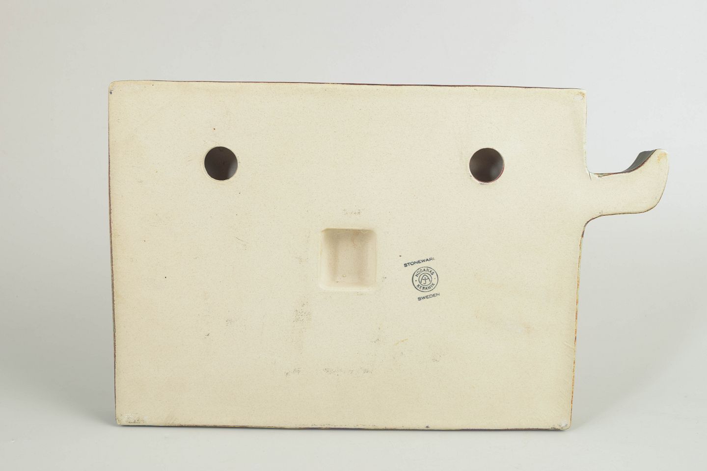 Relief i stentøj med stiliseret dyremotiv i lavt relief, udført i karakteristisk nordisk formsprog. Glasur i dæmpede jordtoner med grønne og brune nuancer, typisk for Höganäs’ produktion i perioden.