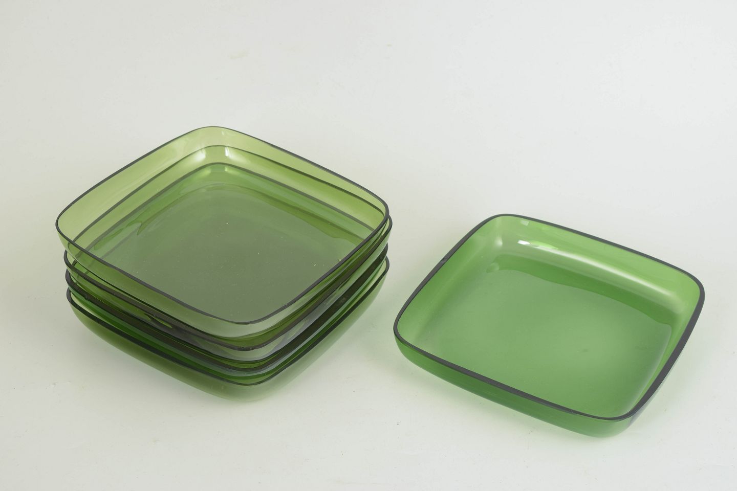 Sæt bestående af fem håndlavede tallerkener i grønt glas med blødt afrundede hjørner og let opadbøjet kant. Et enkelt og funktionelt formsprog med tydelig skandinavisk modernistisk karakter.
